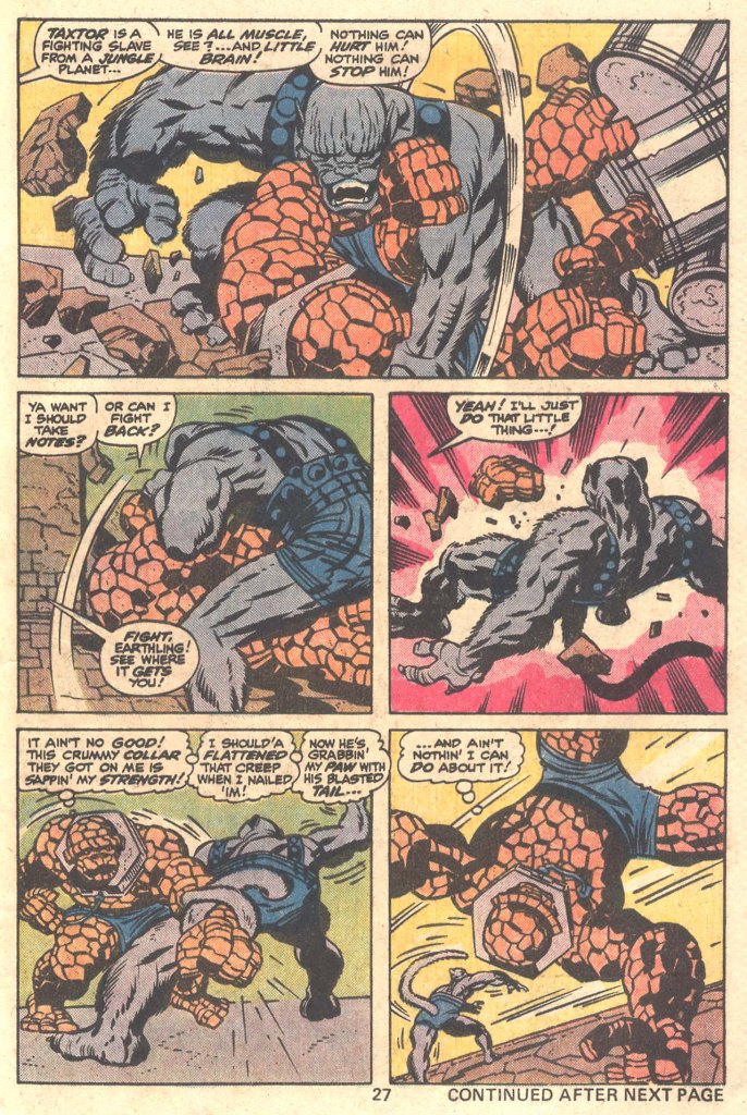 This entire issue focuses exclusively on the Thing. And that’s due to the fact that, by 1978, the length of a new Marvel comic had been reduced from 20 pages to 17–18 if you dropped the letters page. So when these earlier stories were reprinted, they would need to have pages cut out of them in order to fit the space. In this instance, the scant pages dealing with Reed, Sue and Johnny becoming aware that Ben is missing were the sacrificial lamb–which made reading all four of these issues in sequence a bit baffling, as the FF head into space in pursuit of Ben without ever having realized that’s where he must have been taken. A casualty of editing. Anyway, this is the Thing’s show from end to end, and he’s a put-upon participant for the duration. Time and again, he attempts to win his freedom through brute force, and in each instance, the superior technology of his captors proves to be overwhelming.