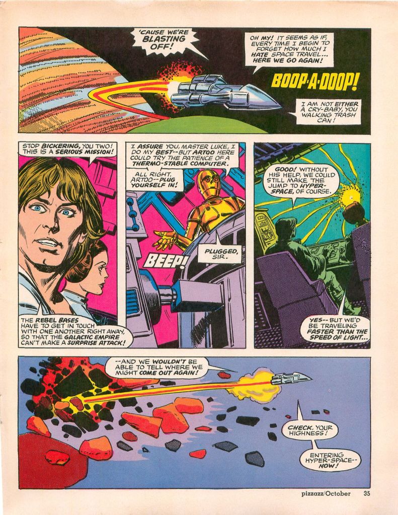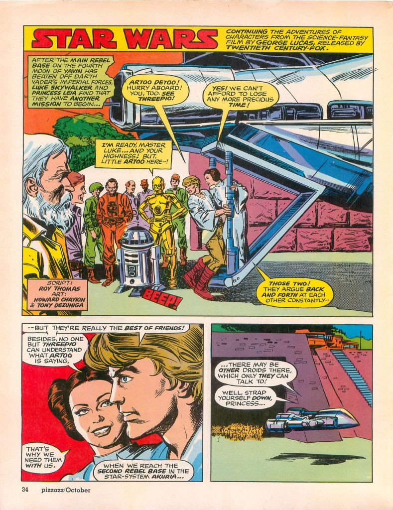 These original STAR WARS strips (by the title’s regular creative team of Roy Thomas and Howard Chaykin) are probably the best-recalled part of PIZZAZZ.