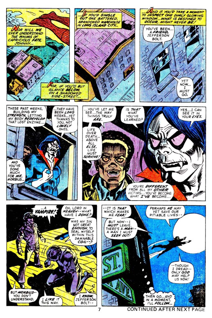 And then at the end we get one actual new page, so generically drawn that it could be anyone from Win Mortimer to Arvell Jones, and apparently inked into submission by Mike Esposito, that in the cheapest of ironies, Spidey’s pointless and barely-motivated memory actually leads in to the return of Morbius.