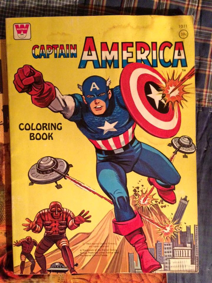 Here’s a 1966 Whitman CAPTAIN AMERICA coloring book, whose artwork was loosely based on a recent adventure Cap had with Nick Fury in TALES OF SUSPENSE. Jack Kirby’s design of THEM’s Alchemoid is featured prominently.