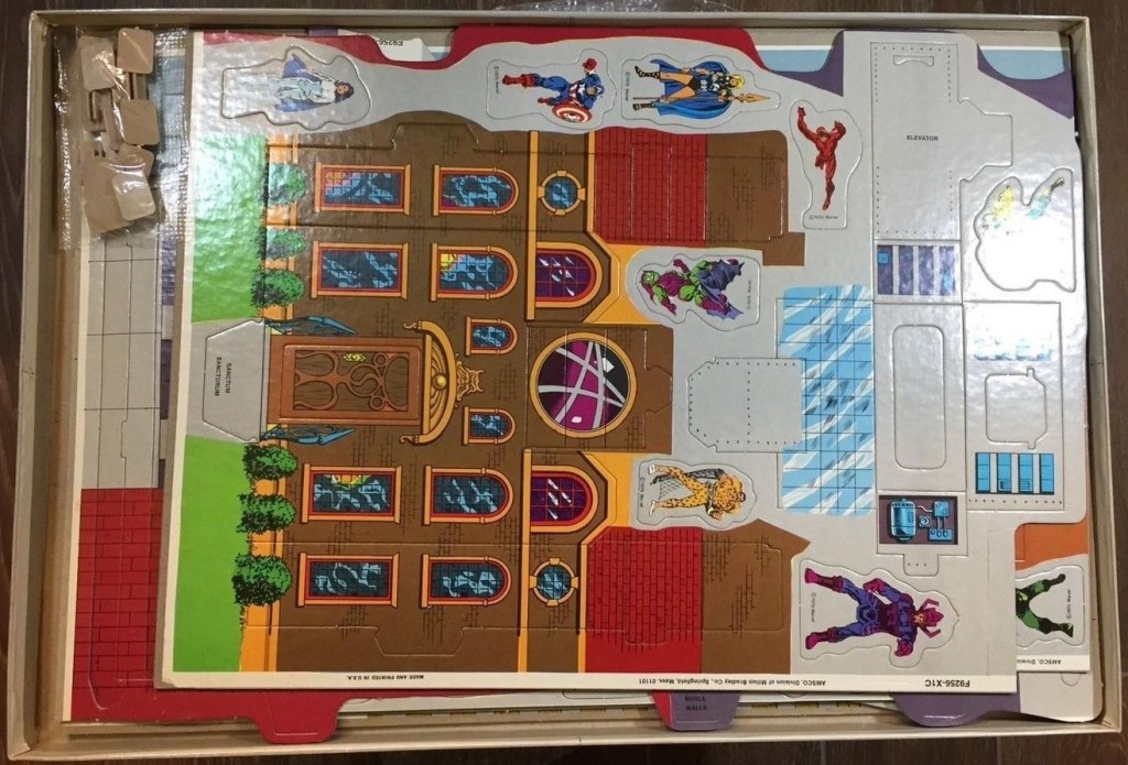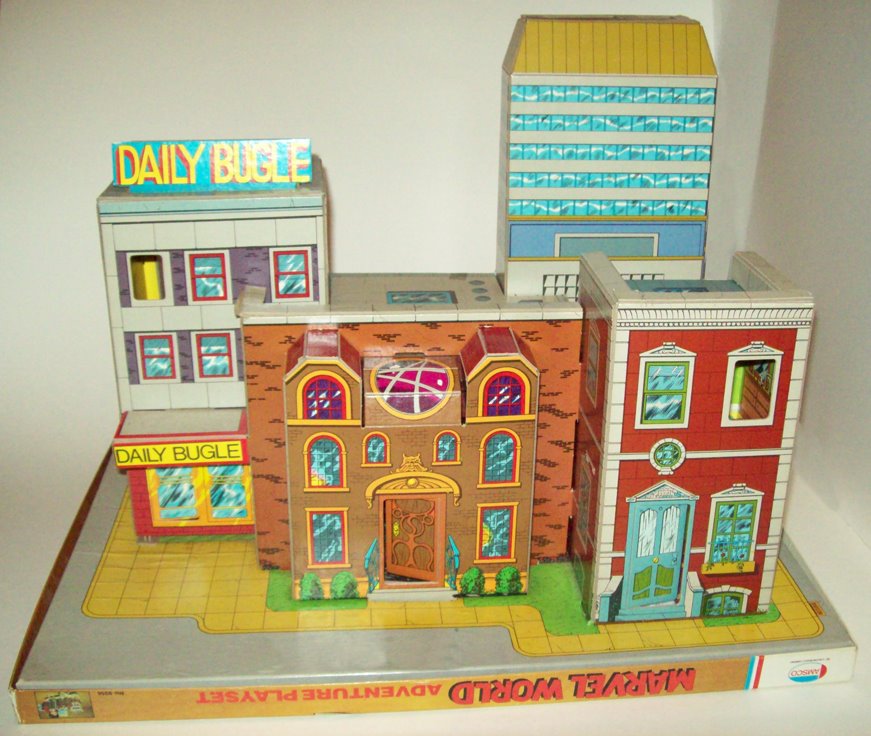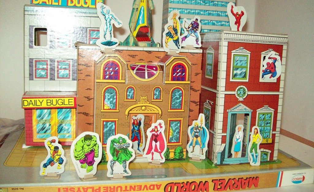 And let’s close out with perhaps the most desirable Marvel item of its day, the AMSCO MARVEL WORLD ADVENTURE PLAYSET. This miraculous cardboard construction included the Baxter Building, Dr. Strange’s Sanctum Sanctorum, Avengers Mansion, Peter Parker’s apartment and the Daily Bugle building, as well as a bevy of super hero stand-ups to array throughout it. Released in 1975, I’ve always wanted one and have never been able to lay hands on it.