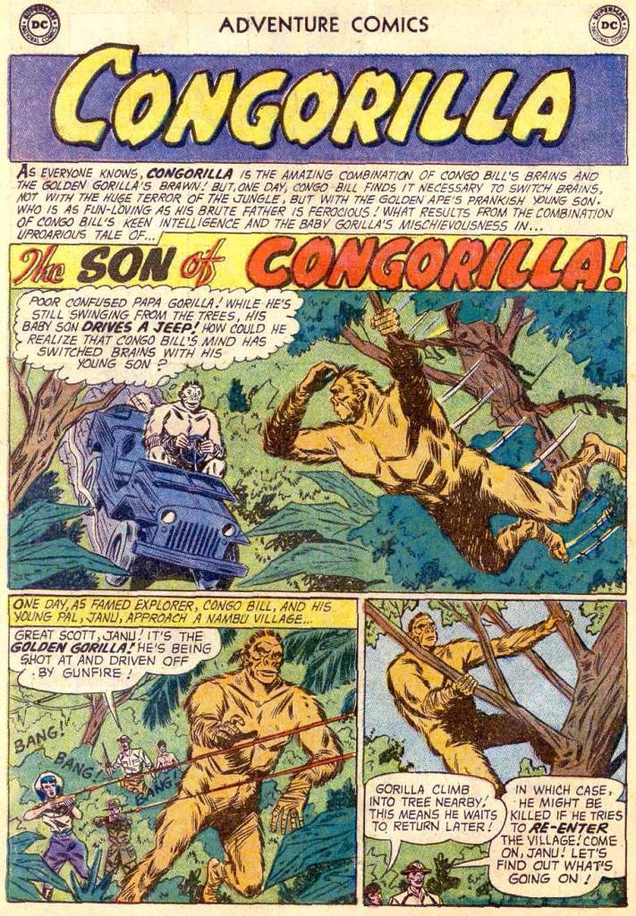 ADVENTURE COMICS wasn’t solely the home of Superboy but ran two additional features at this time. And after a pair of filler one-page comedy and public service strips, the second story begins. It’s an adventure of Congorilla, written by Robert Bernstein and illustrated by Howard Sherman. In this series, hunter Congo Bill typically transferred his mind into the body of a gigantic Golden Gorilla by means of a pair of magic rings. But in this story, Bill switches Conorilla’s ring to another ape, the son of Congorilla, in order to save the young simian from captivity. This he does in six professionally-crafted pages that otherwise don’t make a bit of impact whatsoever. Many of these short gimmick back-up strips weren’t very memorable, I’m afraid.