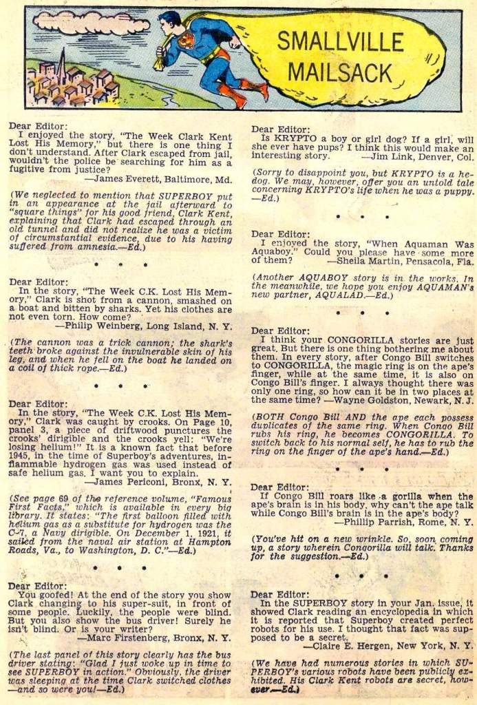 Next up was the Smallville Mailsack letters page, which, as were all of Weisinger’s letters pages, primarily ran letters from its young audience. Many of the letters have a “gotcha” quality about them, where the readers try to spot mistakes in previous stories and Weisinger talks his way out of them. And a good time is had by all. The next page includes three more Coming Super-Attractions, the house ads for Weisinger’s other Superman books then on sale. These were always fun in that they weren’t very visuals-oriented, relying on the strength of story concepts to get buyers interested. Jimmy Olsen becomes a Werewolf! Superboy meets Supergirl despite living in different eras! Superman discovers a whole planet of Bizarros! How could any kid with twelve cents in their pocket not want to hunt down these stories at their local newsdealer?