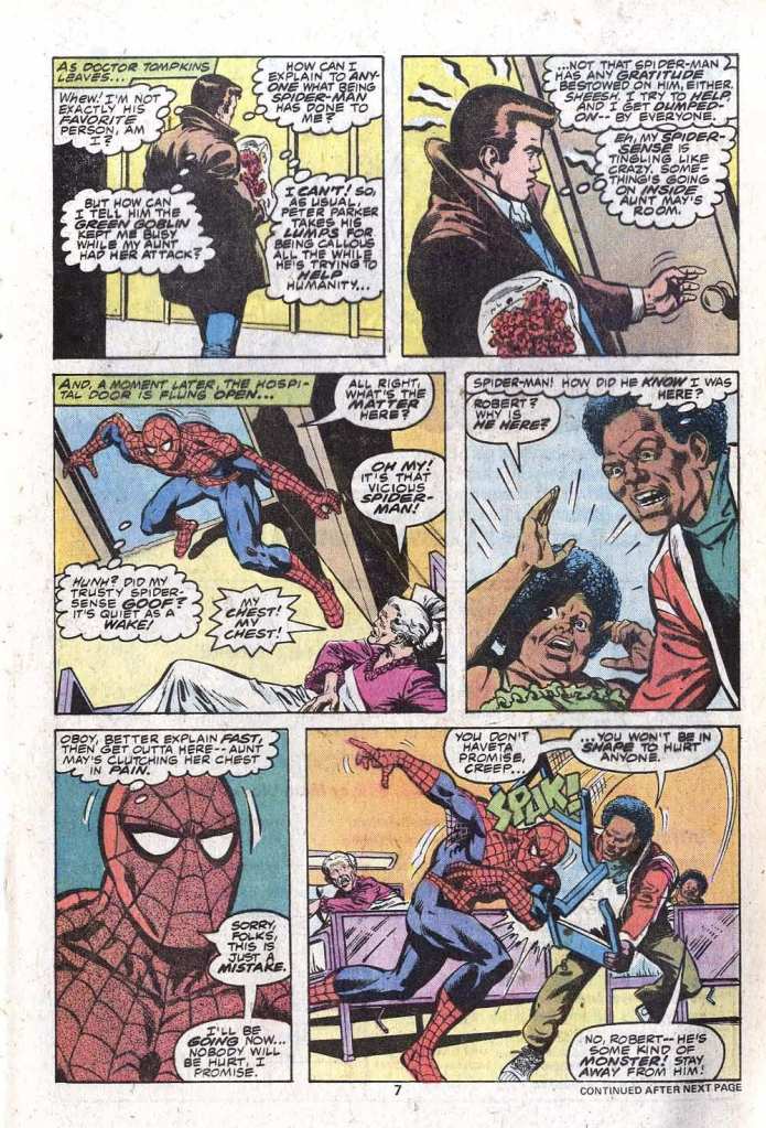 So after some preliminaries, this issue gets its action going when Peter Parker drops in at the hospital to visit his bed-stricken Aunt May. As it turns out, Robert Farrell is there at the same time, visiting his own mother. And wouldn’t you know it, the two are sharing a hospital room! So it happens that as Peter approaches the door to the room, his spider-sense begins to go off big time. (This isn’t quite a proper use of the spider-sense, by the way, as Farrell doesn’t intend any harm to Peter. But things were still a bit loosey-goosey in that department in 1978.) Pete immediately changes to Spider-man and bursts in–almost causing Aunt May to suffer another heart attack. While he tries to calm his aged relative down, Farrell figures that the web-slinger has tracked him down to the hospital, and he switches into his costumed identity to boot. The running fight between the pair exits the hospital and continues on the streets beyond.