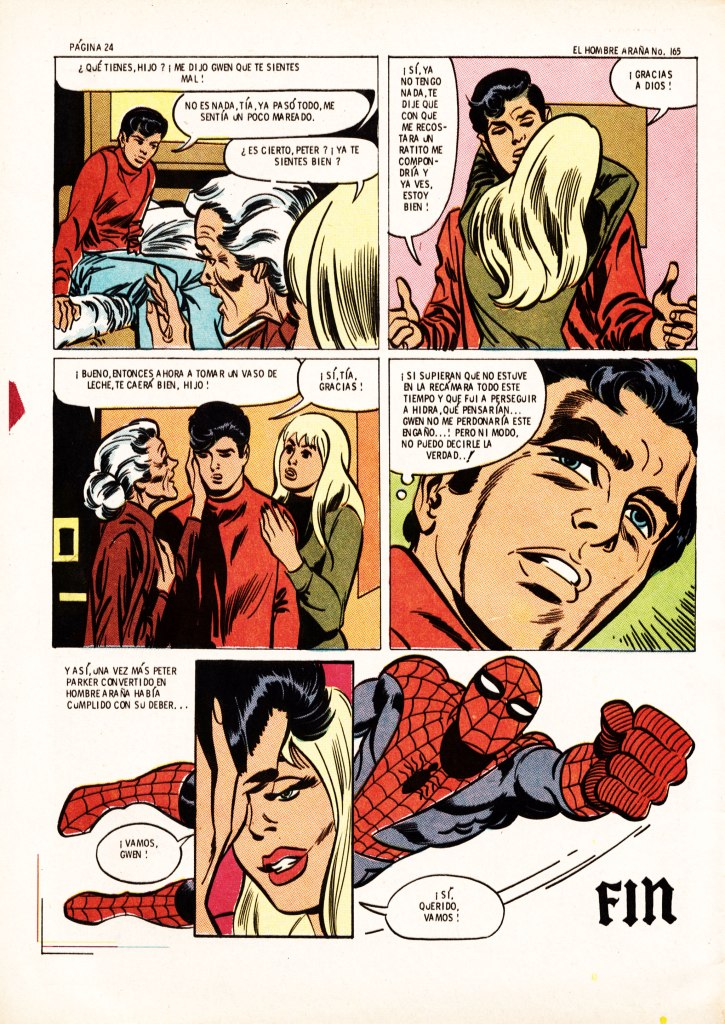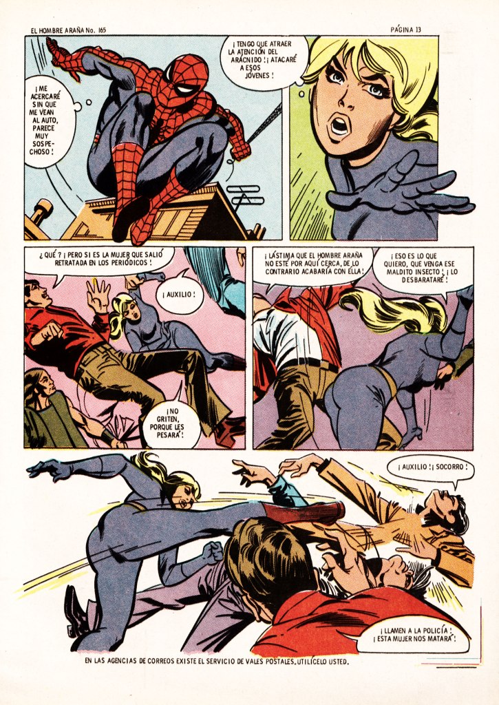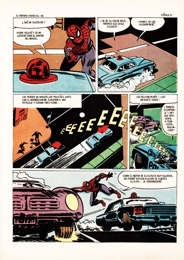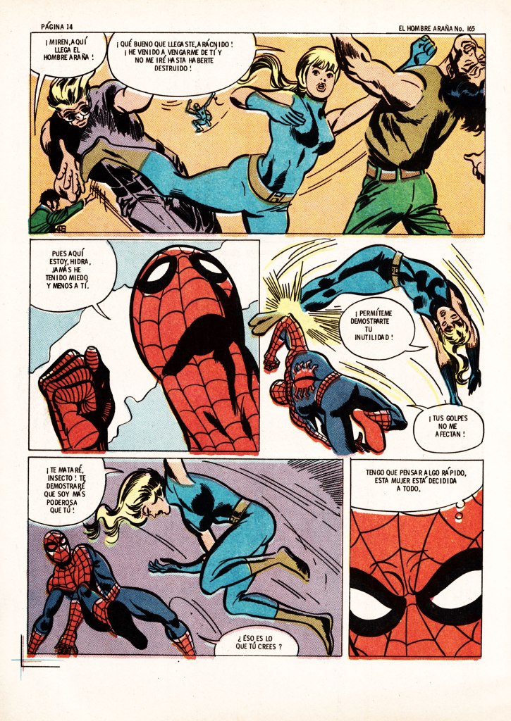 A couple big time Gil Kane swipes, notably the second panel. It’s difficult to make out, but those are other La Prensa titles on the magazine rack, including EL SARGENTO FURIA and PEPITO, as well as issues of LA SORPRENDENTE HOMBRE ARANA, of course! I’m told that in addition to these new Spidey stories, La Prensa also produced a bunch of never-reprinted new localized Sgt, Fury stories as well–something i’m investigating further.