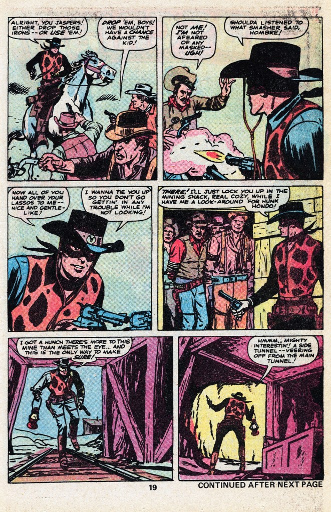 Unfortunately for all concerned, the fight starts a cave-in that collapses the mine shaft that the pair are in. Fortunately, though, this is a Comics Code-approved story for the 1960s, so only the Purple Phantom is caught in the cave-in, and even he ultimately emerges from it essentially unharmed. But all of teh fight has gone out of him, and in the story’s final few panels, he explains his tricks to the victorious Kid. In the end, Perkins gets his worthless silver mine back–but also the reward money for capturing the Purple Phantom. The Two-Gun Kid insisted that it was rightfully his. Even as a reprint, this story felt quaint and of another era in 1978 when i read it, and it’s no surprise that tales of this sort failed to pull in enough readers at that late date, as the western in general had fallen out of fashion, to keep the book afloat. But Two-Gun would live on, in the pages of Steve Englehart’s AVENGERS among other places. And eventually, he’d even appear in further stories set in his own milieu, the old west.