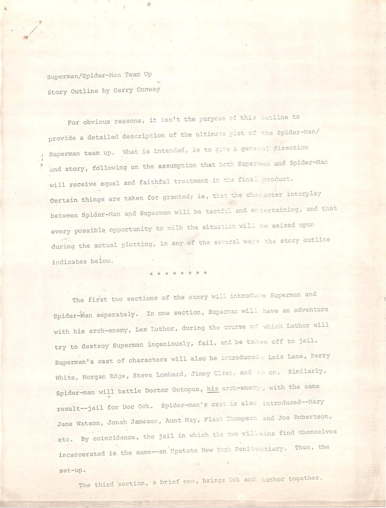 The person chosen to write this groundbreaking special was Gerry Conway. He was an obvious selection, in that at that particular moment he was the only writer in the field who had regularly written both characters at their respective companies. Additionally, DC editorial director Carmine Infantino, who had writer selection, wanted to jab a thumb into the eye of his Marvel competition, from whom he’d recently hired Conway away. Conway undertook this difficult assignment, striving to make both outfits happy and deliver a story that was worthy of such an epoch-making event. His initial attempt at an outline, reproduced here, if anything goes a bit too far in this regard. But it does give us a unique insight into the crafting of this signature story. Here, his preamble amounts to, in essence, asking the editors at both outfits not to nickel-and-dime him on the plot construction at this early stage before diving into the storyline specifics he has in mind.