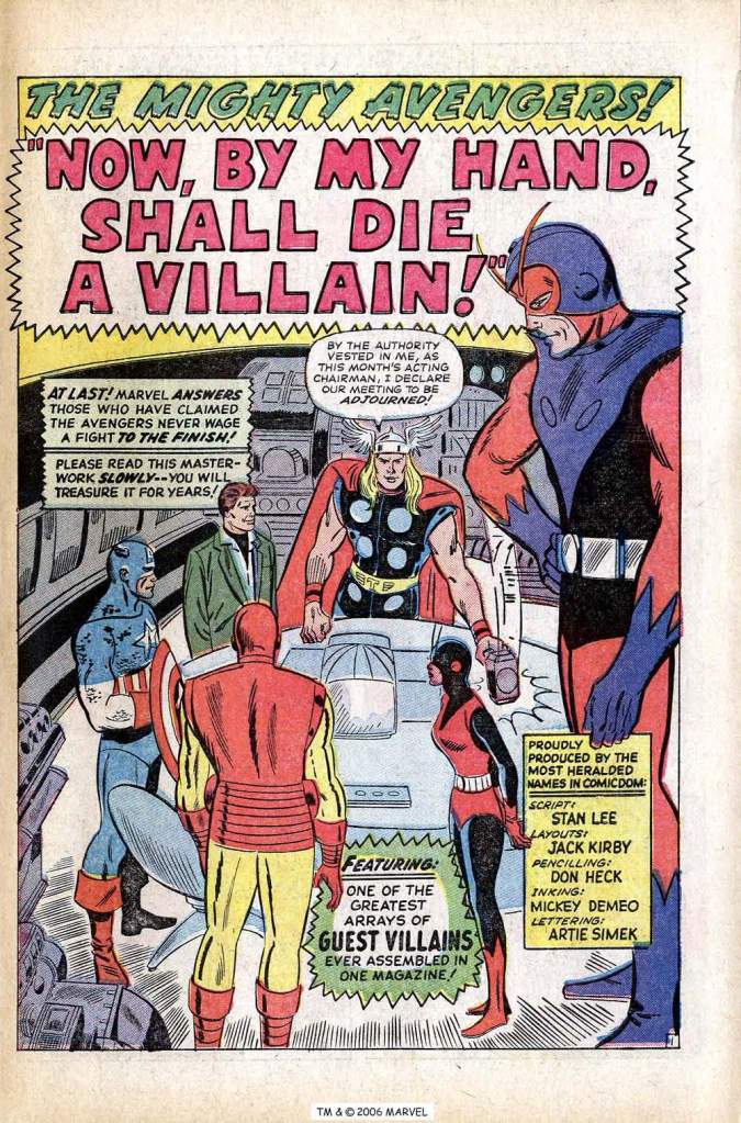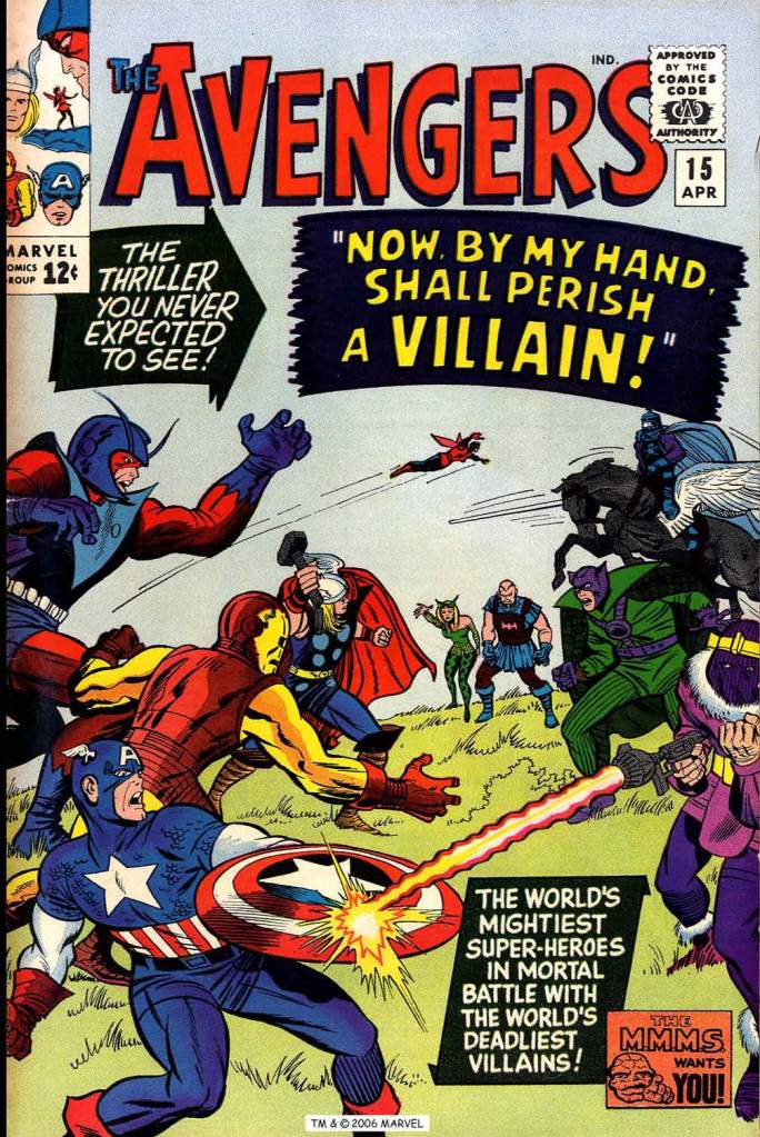 It must be said that the previous few issues of AVENGERS were relatively weak stuff–in particular the one just before this one, #14, which clearly was one of those disaster comics that comes up every once ina while (and about which I will no doubt write before too long.) Having turned the bulk of the plotting over to stalwart artist Don Heck, Lee was uncomfortable with the results. And so, in his desire to right the ship and to set up a transformation on the title, he brought Kirby back in to do layouts–which translates to having him do the plotting at a cut-rate price. Kirby’s hand is detectible in the artwork from place to place, but largely he’s invisible–it’s his story sense and dramatics that Lee needed here.