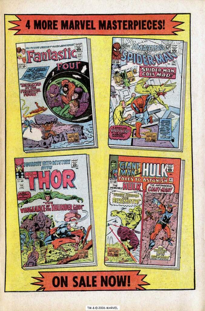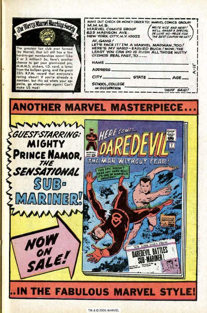 The Marvel titles were really rolling at this moment, and so next comes a pair of ads for even more books in the line–first one of the standard three-for ads and then a special spotlight on DAREDEVIL #7 with its Sub-Mariner guest appearance and new look for the title character. There’s also a solicitation for readers to join the Merry Marvel Marching Society, Marvel’s in-house promotional club, through which Lee did even more to further brand loyalty.
