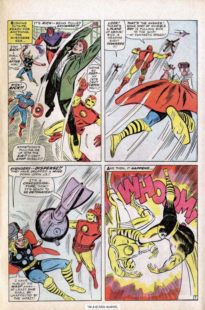 Anyway, in terms of the story, Zemo has determined that it’s time to stop pussyfooting around with the Avengers and to finish them off once and for all, in particular his WWII nemesis Captain America. To that end, he assembles the Masters of Evil once more–this time, including the Black Knight and the Melter, who had been part of the initial group but who had both been captured and thus stricken from the roster. For some reason, the Radioactive Man didn’t get the call-back, possibly because Zemo thought he was dead, possibly because Kirby simply forgot about him. In any event, this is now the largest crew of Masters there has been, and they’re ready to strike. Zemo’s first gambit is to capture Rick Jones, who has aspirations of becoming the new Bucky, Cap’s partner. Because Zemo was responsible for Bucky’s death, Cap flies into a rage when Rick is similarly imperiled, and Iron Man requisitions him a jet so that he can follow Zemo’s escaping craft back to South America for a fight-to-the-finish.