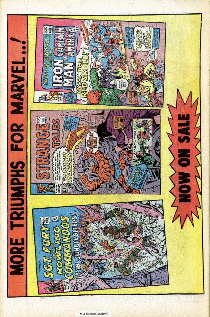 Another way they did that was through the house ads and text pages that would run in the books, such as this one. It was the standard format by this point to show off four upcoming covers rather than the three that had been featured for a long while–the line had simply grown that much in the interim. And there really was no better hook for a Marvel reader then gazing upon one of these covers and becoming excited about the wonders to be found inside the book.