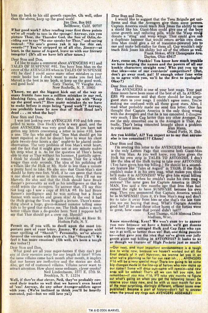 But really, nothing truly embodied the essence of the Marvel recruitment manner more than a book’s letters page, and here’s the one for this issue. Lee hasn’t yet inaugurated the Bullpen Bulletins page, so a portion of it is taken up with the Mighty Marvel Checklist, which describes several of the issues that readers got to see the covers to a couple of pages earlier. There was also a great, fun sense of personal interplay between Lee, answering letters, and the letter-writers, many of whom had read enough of these pages by this point to understand how to pitch their correspondence in order to have the best chance of getting printed. These were still days before message boards or direct e-mail communications, so sending a tangible letter or postcard to Marvel was the only way to make one’s feelings known. And for any letter that was slated to see print, Marvel (in teh person of Flo Steinberg usually) would dash back a postcard informing the reader of that fact.