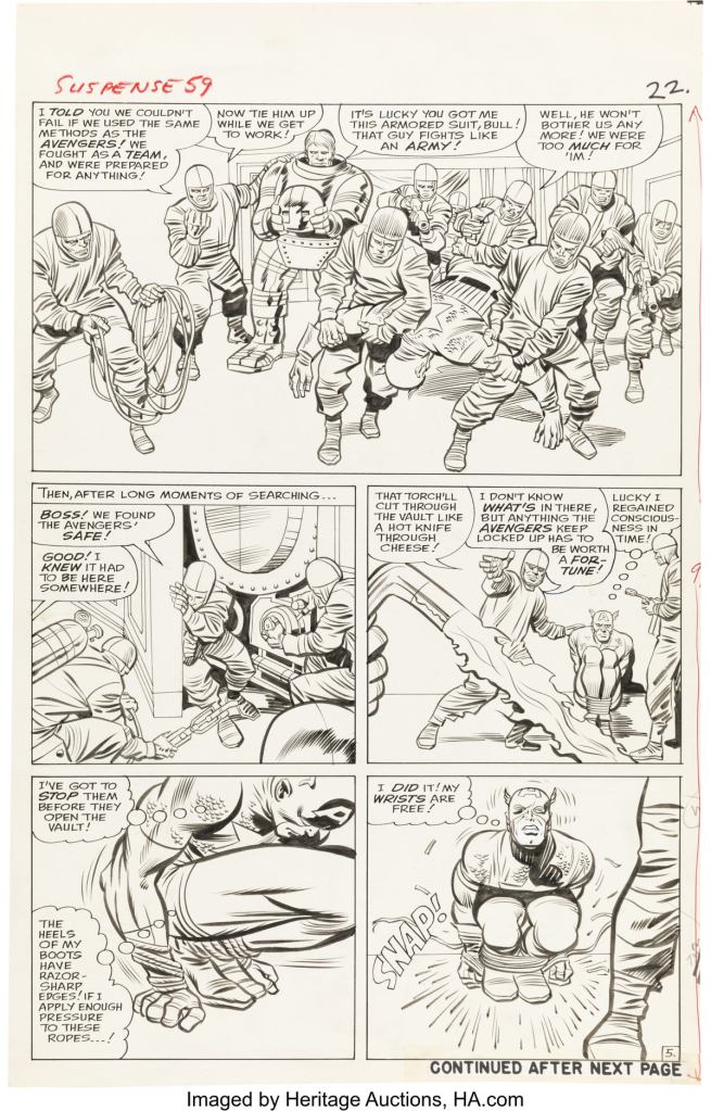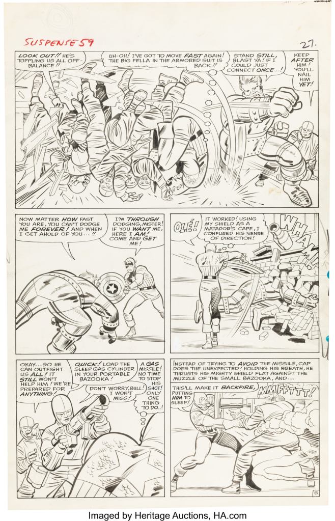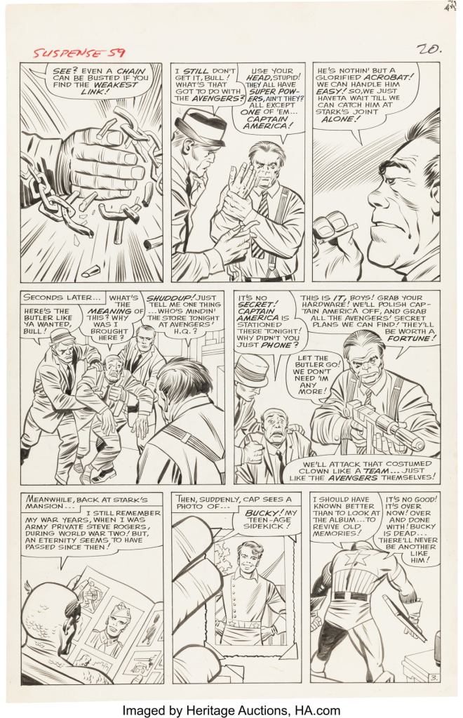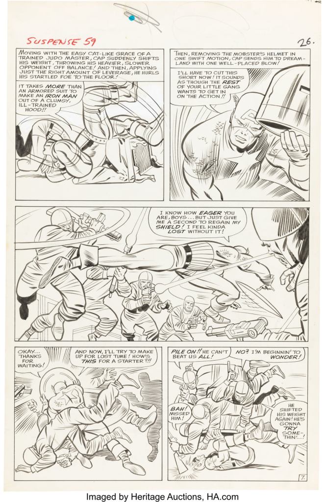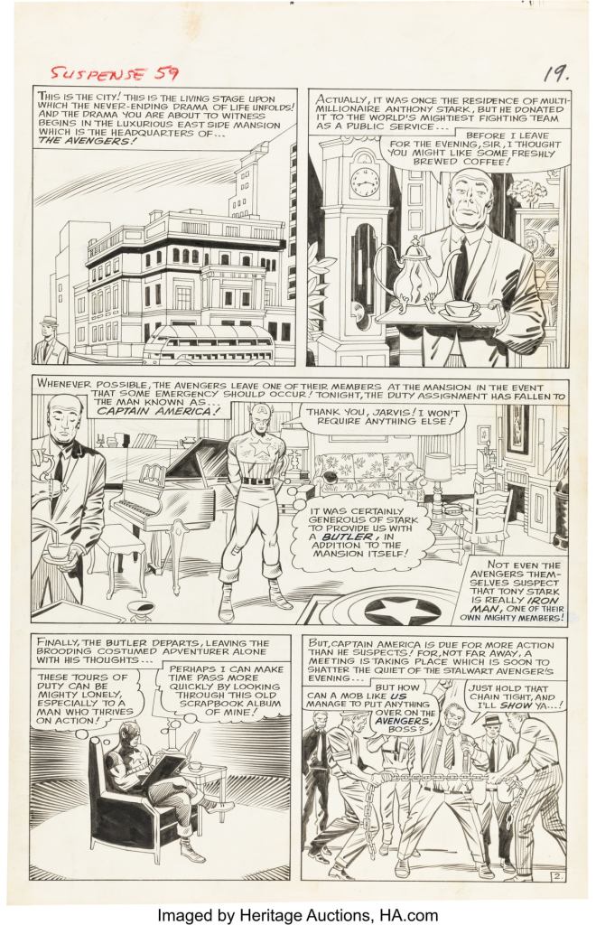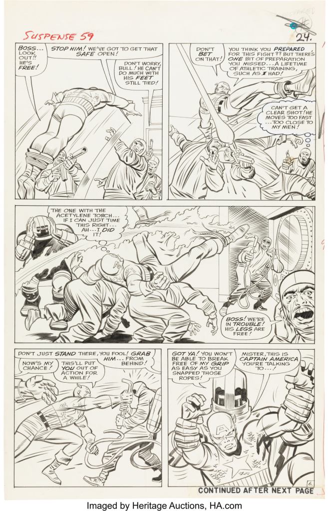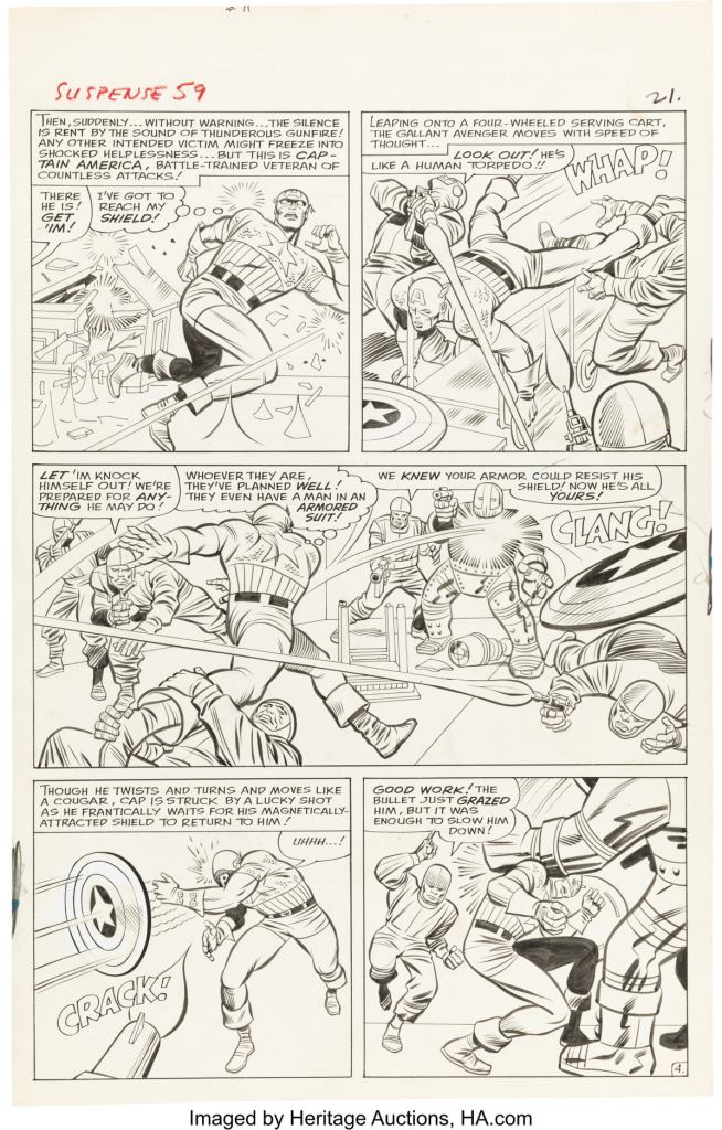 The original artwork for classic stories is always of interest to me. There’s a bunch of information that we can discover from it. And even apart from that, it’s often fun just to see how these stories were originally drawn, without the added intermediary step of them having to be reproduced and printed in a comic book. There’s no color as well, so the specific lines can be studied in depth. As it so happens, Heritage Auctions is offering the entirety of the original artwork to the inaugural Captain America story from TALES OF SUSPENSE #59 from 1964, which represents the first Captain America solo story produced since 1954, and the first one that the character’s co-creator Jack Kirby had drawn since 1941. This was the beginning of Captain America becoming a hallmark character of the Silver Age of Comics. so let’s take a look at it and see what we can see.