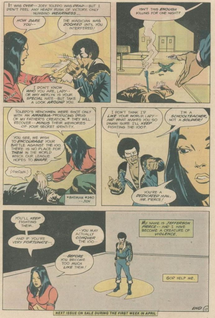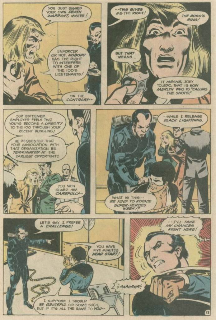 Isabella has learned his storytelling chops over at Marvel, and so he brought a distinctly Marvel-esque sensibility to BLACK LIGHTNING, in particular in how it interfaced with the rest of what wasn’t then quite a DC Universe. So Black Lightning operates in Suicide Slum, the nasty part of Metropolis established by Jack Kirby. His confidant Peter gambi is the brother of Paul Gambi, the tailor to the super villains. He’s taking on the criminal syndicate called the 100 who had bedeviled Lois Lane and Rose & the Thorn in the past. And in this issue, he brings in Merlyn, an archer and master assassin from an old JUSTICE LEAGUE OF AMERICA story, who was affiliated with the League of Assassins. This was Marvel continuity threading 101, but it gave BLACK LIGHTNING a texture not readily apparent in most of the rest of the DC line.