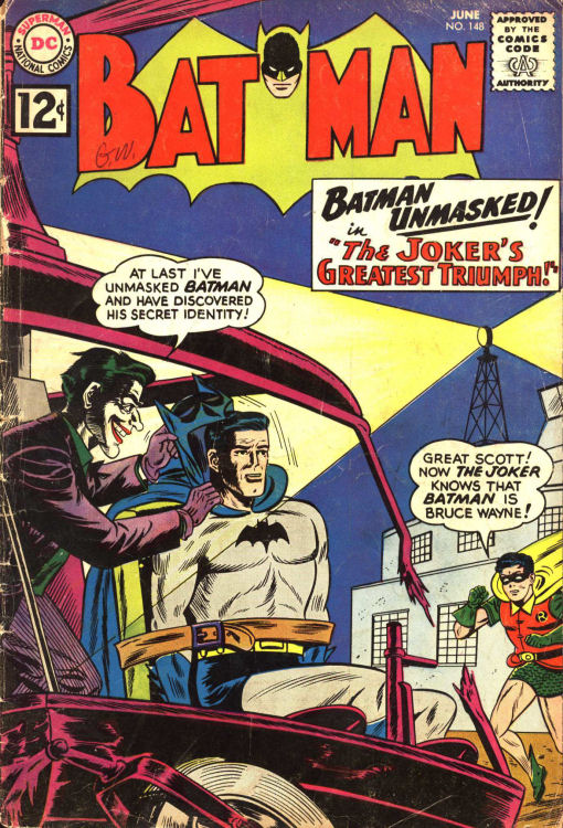 Following the usual established pattern, the cover-featured story ran last in this issue. As with the previous story, it was written by Bill Finger and illustrated by Sheldon Moldoff. This was the era in which the Joker had been largely neutered, his insanity and homicidal tendencies replaced with a maniacal sense of humor and a penchant for colorful theme-based crimes. This episode opens with the Joker having delivered a clue to one such heist to Police Commissioner Gordon. But Batman sees through the ruse in the clue, and is correct in determining the Joker’s actual target. Unfortunately, the clown gets the better of him, and in a scene duplicating the cover, succeeds in unmasking the Caped Crusader. (The cover was definitely commissioned first, and this story written by Finger to match it.)
