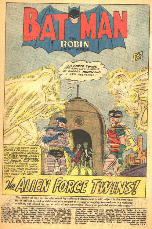 The story is relatively basic: flying over an unnamed “distant country”, Batman and Robin happen across a weird city. Investigating , they are attacked by a pair of energy watchdogs called “Force Twins” at the behest of a couple of alien beings who are prospectively looking to colonize our world. The Dynamic Duo is able to keep one step ahead of the Force Twins, while Batman works out that the aliens are vulnerable to common water, and is able to drive them away by drenching them. The last page in all DC stories in 1962 was only 2/3 comics, leaving room at the bottom for an ad promoting other titles in the line. So here, we get a small but elegant Ira Schnapp-designed plug for the current issues of DETECTIVE COMICS and WORLD’S FINEST COMICS, Batman’s two other publication homes.