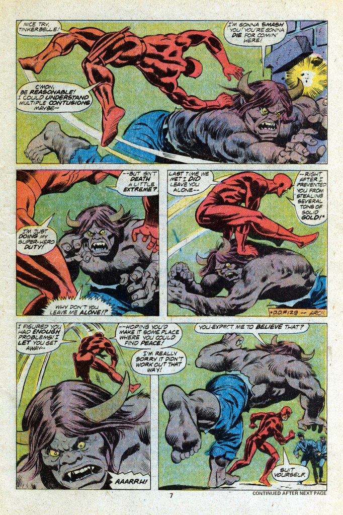 The artwork on this issue was produced by Lee Elias, an old pro from a bygone time mostly, whose style had once been the ideal at DC in the 1950s, but whose super heroes were often a bit awkward. Polished inker Dan Green here helps to smooth over some of Elias’ rougher edges, but there are still a number of poses that are a bit bizarre, and reminiscent of the manner in which Frank Robbins would stage his super heroes. I suspect that Elias may not have been quite as comfortable working in the Marvel method, where a lot of the choreography was left in his hands. On that page above, for example, there is hardly a background to be found. This isn’t a bad looking issue of DAREDEVIL, but it is just a shade “off” in its execution.