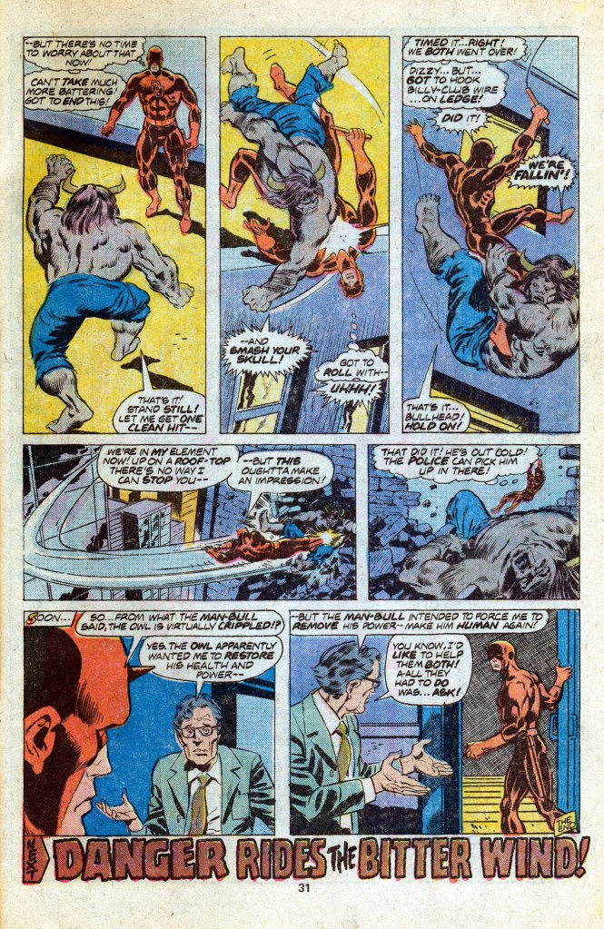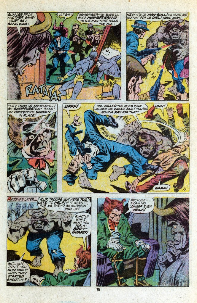 And so Daredevil is there when the copter ferrying the Man-Bull arrives, carrying the Professor in tow. But the Man-Bull acts out, saying that he’s not going to turn the Professor over to the Owl. In the midst of this disquiet, Daredevil shows up, and he and the Man-Bull engage in some fisticuffs at the top of the building, while being peppered with shots by the Owl’s men. The vulnerable Owl, not really able to cope with either combatant, stages an advisable retreat. And Daredevil is able to lure the Man-Bull into flinging the pair off the rooftop, so that DD can use his billy club line to swing the Man-Bull into the side of the building, knocking him out. And that’s a wrap this time, apart from Professor Kerwin revealing to Daredevil that he would happily help both the Owl and the Man-Bull cure their afflictions–they only needed to ask.
