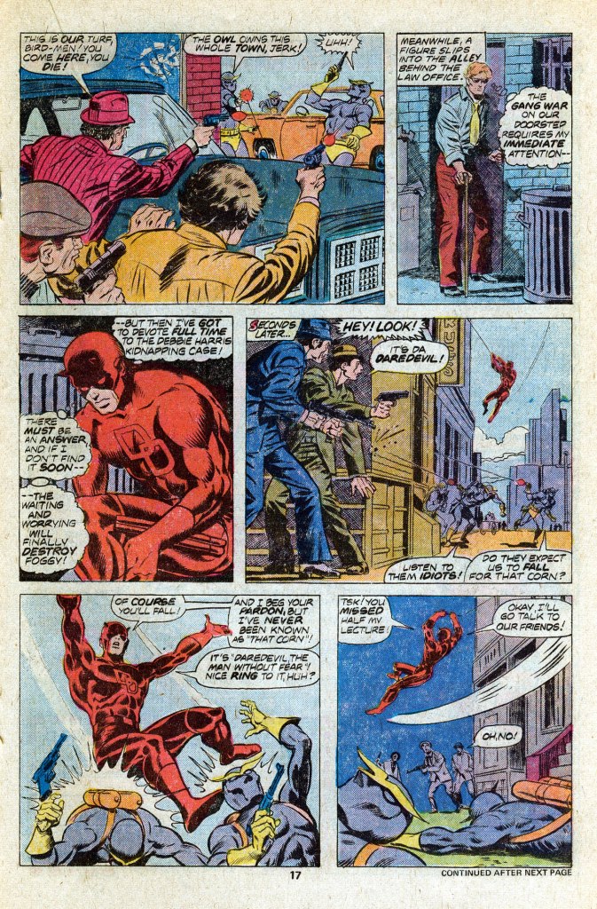 The Owl has liberated the Man-Bull in order to offer him a position as the avian criminal’s bodyguard. You see, the Owl is locked in the midst of a gang war, and he’s at a serious personal advantage, in that the serum that gave him the ability to fly has also, over time, caused his legs to decay. The gangland situation gets so bad that there’s a shootout right outside Murdock and Nelson’s storefront legal office, causing Matt to put habeas corpus aside and don his Daredevil duds to intervene. Shooter works in some copy throughout this sequence to cover for the fact that, in prior issues, Foggy Nelson’s fiance had been kidnapped and was missing, and that Daredevil ought to be devoting his time to finding her. During the scuffle, Daredevil finds a mysterious card–but without his sight, he can’t tell exactly what it might be.