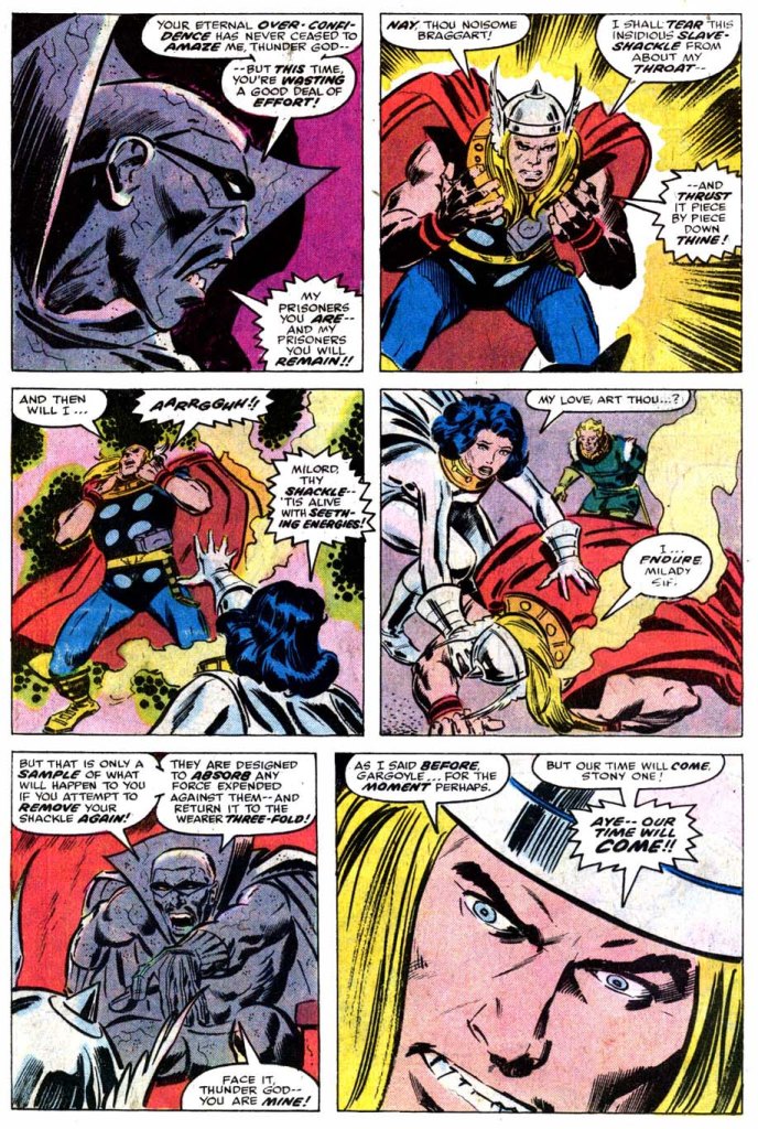 Anyway, it turns out that the Rigellian Recorder holds the key to Thor and the Asgardians’ escape. Being not a living being but rather a device in humanoid form, the crippling slave collar has no great effect on him, and he is able to compute how to remove it. Thus freed, Thor begins to stir up the crowd to fight for their liberty. But before he can half get into it, the Grey Gargoyle appears once again before them–and they still have no defense against his stony touch. To Be Continued!