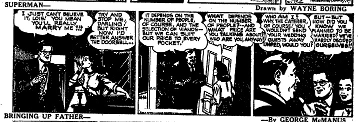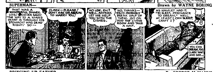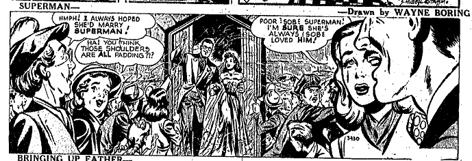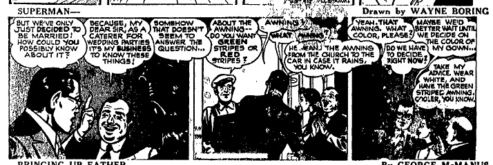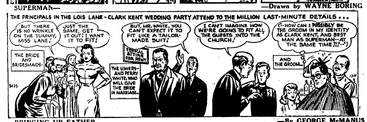 The only byline that ran on these strips during this time was for Wayne Boring. But Boring was mainly handling the Sunday strips, which ran a separate continuity from the dailys. So most of these strips were drawn instead by Win Mortimer. Alvin Schwartz was the primary writer of the strip at this point, and so he doubtless was responsible for this storyline going forward. As I mentioned at the outset, this was clearly intended to be just a passing storyline, a dream that Clark is having after his unsuccessful date. But that set-up is forgotten along the way as a strange thing happens: after a few years of declining interest, suddenly attention is being paid to the strip once again. This was the era in which the wedding of Al Capp’s L’il Abner was a major news story, and it seems as though this sequence prompted a few news stories and got the strip picked up by a number of additional papers.