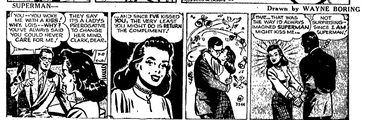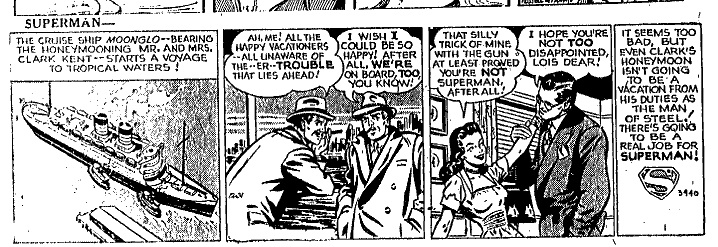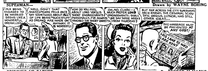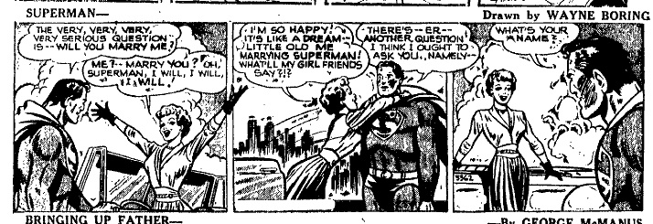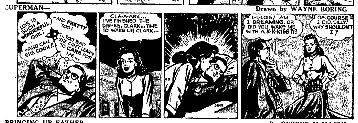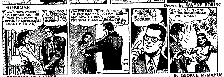 The story in question played out in the daily SUPERMAN newspaper strip that was syndicated all over the country. Because it appeared in newspapers, this was the version of Superman that most casual adult readers were familiar with. At first, it’s pretty clearly set up to be simply a dream, with Clark Kent falling asleep after an evening out with Lois in which she once again refused his overtures. But Clark is awoken (or seemingly awoken) by a more receptive Lois, who is smitten with her fellow reporter and agrees to marry him. This sequence began on September 5, 1949 and the marriage between Clark and Lois would play out over the next two years in the daily strip.