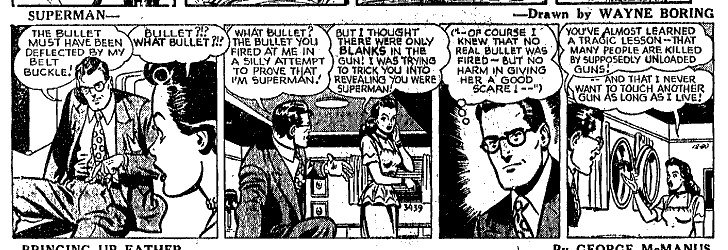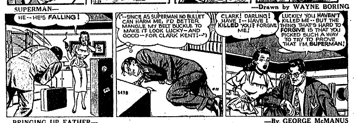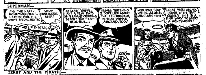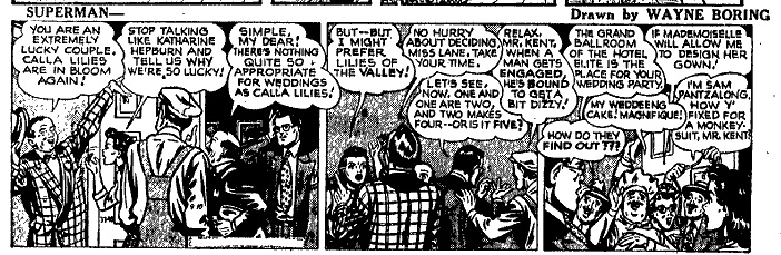 Anyway, Clark Kent and Lois Lane were married through 1952–but only in the daily strip, which focused heavily on their married exploits (including at one point them starting a morning radio show called “Koffee with the Kents.” Lois’ habitual liar niece Suzie also makes a series of return appearances, forcing Clark to go to extreme lengths to protect his true identity from his wife, really for no good reason.