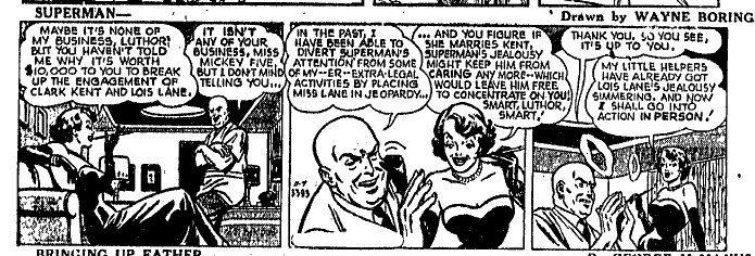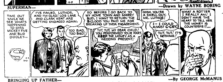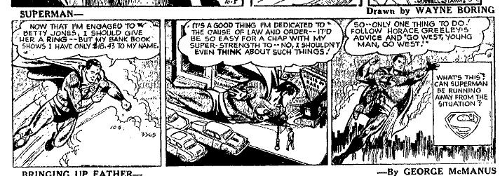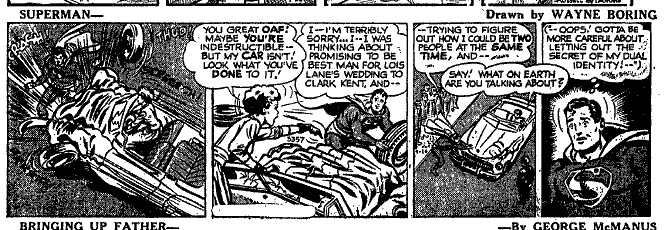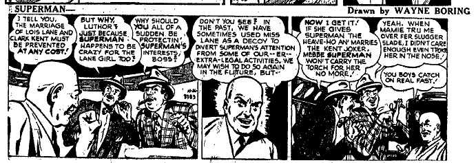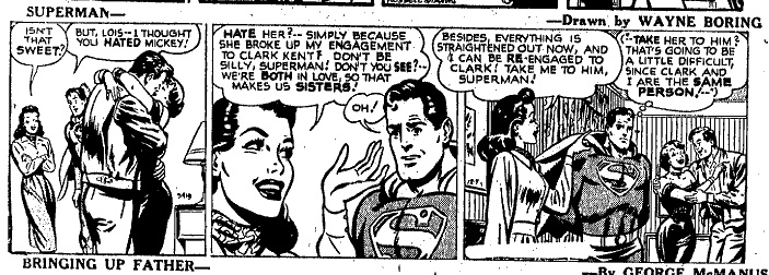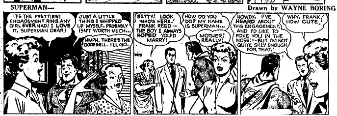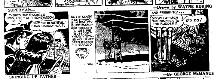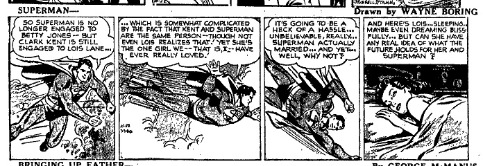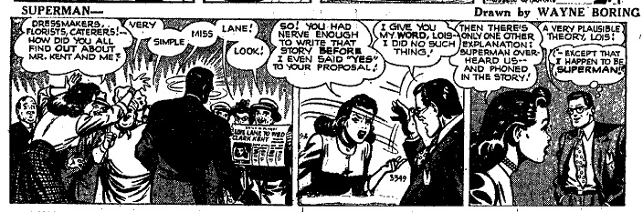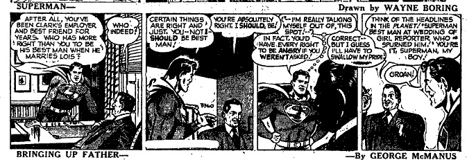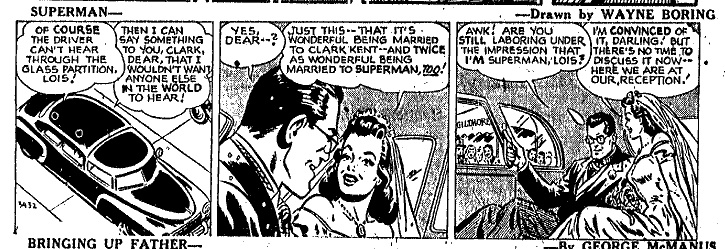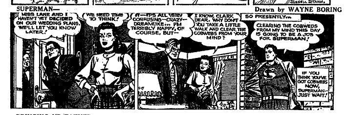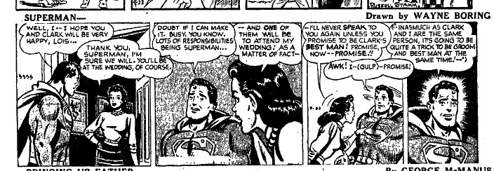 Eventually. a decision was made to get rid of the marriage. It wasn’t being reflected in any other Superman media, in particular the live action ADVENTURES OF SUPERMAN television program that was then being filmed. It seems that this decision was made over Schwartz’s head, as he was replaced as the writer for the strip temporarily, and it was Jack Schiff who wrote the sequence in which we learn that the past two and a half years have all been a projection set up in Superman’s mind by nefarious aliens for their own purposes. Possibly I’ll take a closer look at that sequence in the days ahead.