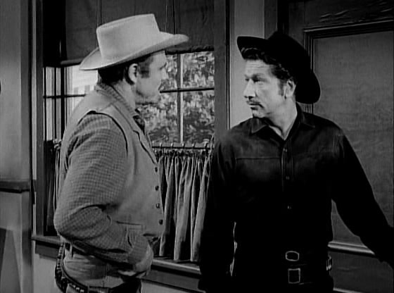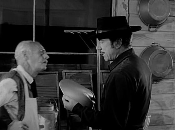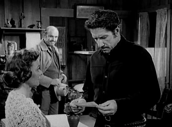 Upset, Paladin rides over to John Griffin’s ranch, where he is welcomed warmly as the man who brought down Griffin’s son’s killer. Paladin questions Griffin’s hand Clete about his and Griffin’s son’s pursuit of Morrow, hoping to find some clue as to the whereabouts of the missing money. Griffin tells Paladin about how, when it became known that the money from the robbery had never been recovered, the whole town went out to dig up the mesa in which Morrow had hidden out in the hopes of finding it. But it was never located. Griffin also indicates good-naturedly that he expects to purchase the Morrow farm for the scant hundreds of dollars that are owed in back taxes. The townspeople figure that he’s owed it given that Morrow had killed his son, so nobody else intends to bid against him. Realizing that Lucy Morrow will be left homeless and destitute, Paladin asks for mercy on her behalf. “Griffin, Lucy Morrow didn’t kill your son.” But Griffin is intent on having his revenge on Steve Morrow, even if it’s only by proxy. “My only hope is, somehow, he’ll know.” he says.