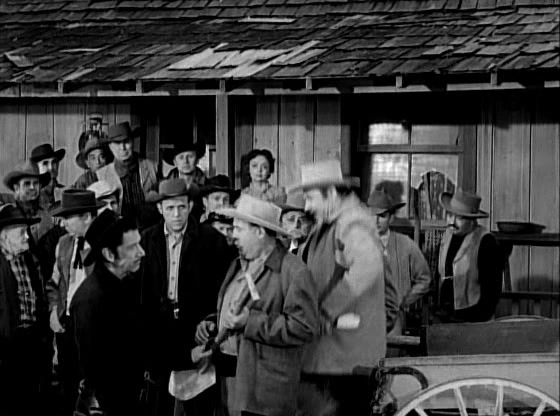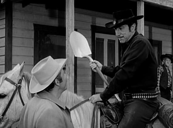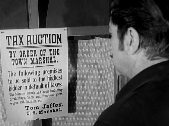 The next morning, we find Paladin at the General Store, where he makes a very loud and very public show of purchasing a shovel. He also confirms with the Marshall when the auction for the Morrow farm will be held. At the auction, Griffin attempts to have Paladin arrested, but Jaffey tells him that Mrs Morrow already corroborated Paladin’s story about how his hand was killed. Griffing is also surprised by all of the people in attendance for the auction, which he thought would be a fait accompli. Jaffey indicates to the crowd that anything bid over the amount of back taxes owed will go to Mrs. Morrow. As expected, Paladin begins bidding against Griffin for the farm. When Griffin complains that Paladin won’t have the money to make good on his bids, Paladin idly brushes his newly-bought shovel and tells him, “Oh, I’ll have it. I’ll have it when the time comes. Now my bid was $500.00” To Griffin’s consternation, other parties among the crowd join in the bidding as well, convinced that the missing money must still be somewhere on the property. Griffin finally wins out, but the cost to him is $5000.00, most of which will be given over to Mrs. Morrow.