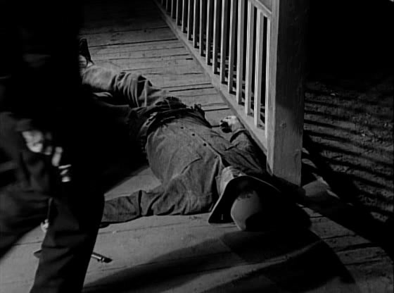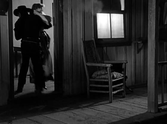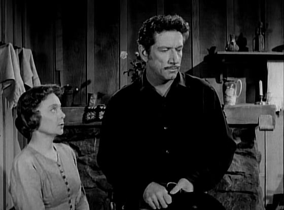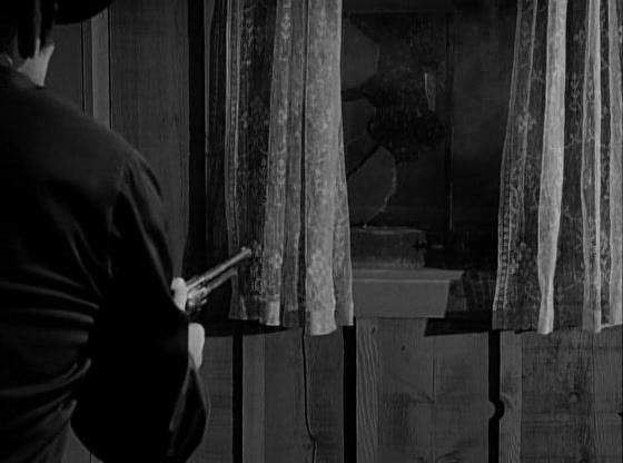Heading back out to the farm, Paladin is confronted by Clete and some of Griffin’s ranch hands, who are intent on making sure that nothing interferes with the auction tomorrow. They’ve got Paladin in a crossfire, but when Lucy opens the front door, awoken by the noise outside, Paladin leaps through it, knocking the widow out of harm’s way. He returns fire through the window, killing one of his two attackers and driving Clete to flee. Once again, though, Paladin has brought death to the Morrow farm, and he apologizes to Lucy. “Did it have to happen at all, Mr. Paladin? Or have guns and killing become your way of life” All Paladin can say in response is a quiet, “No”, followed momentarily by, “I hope not.”