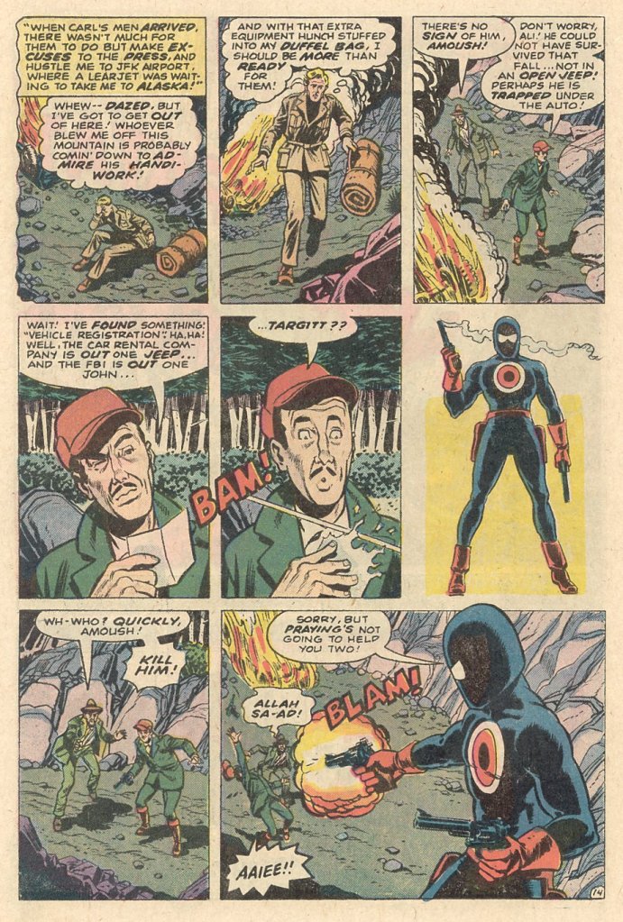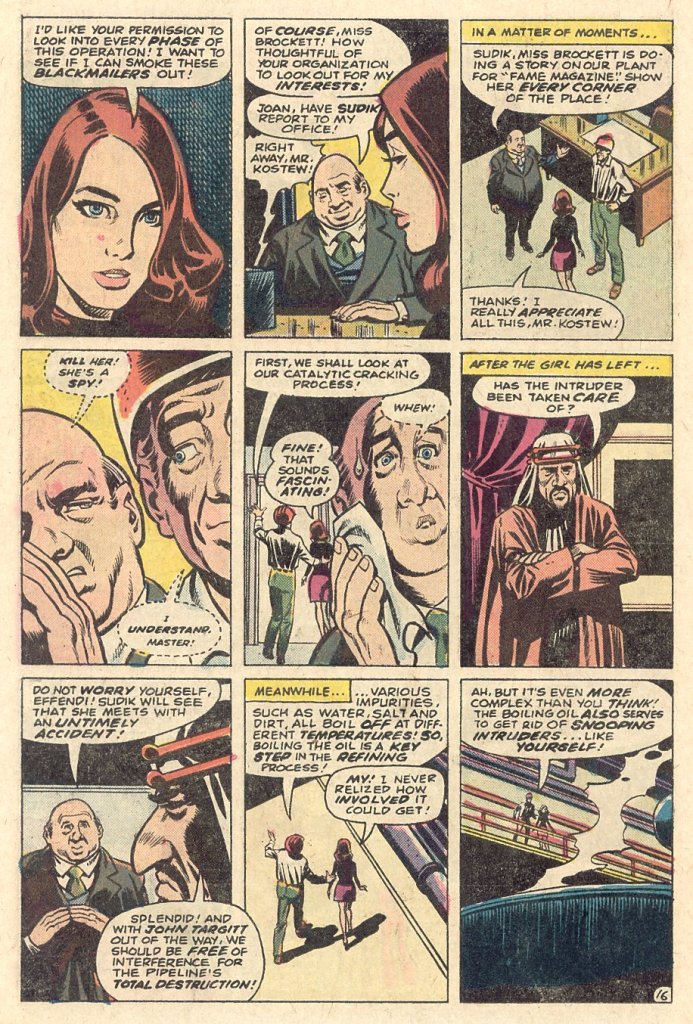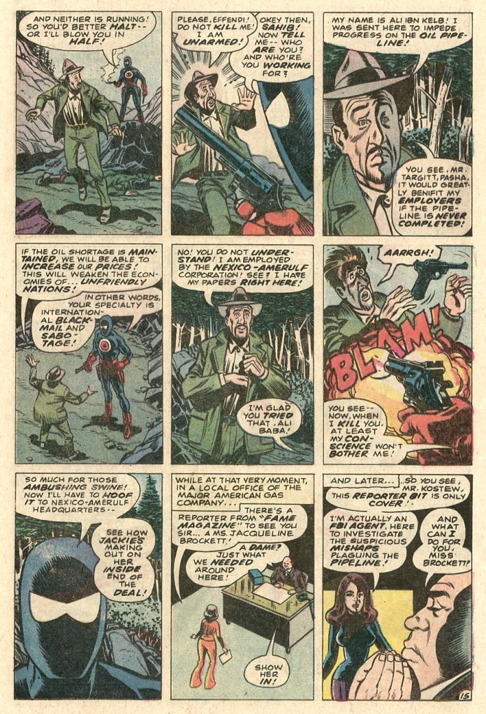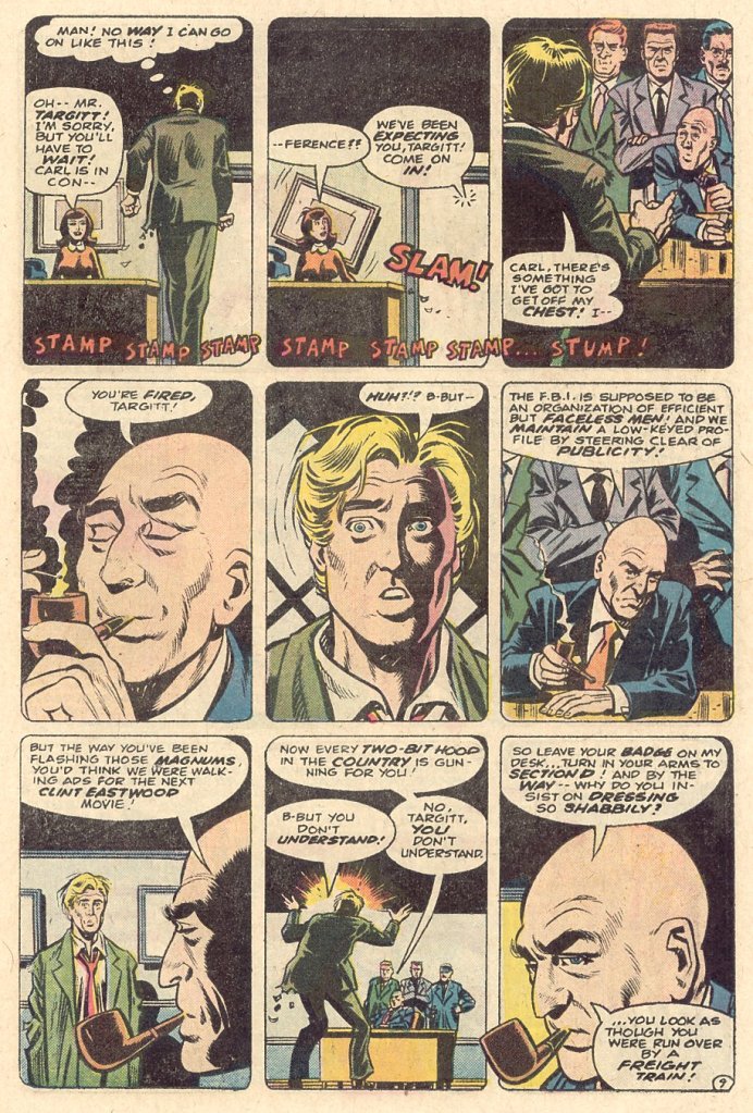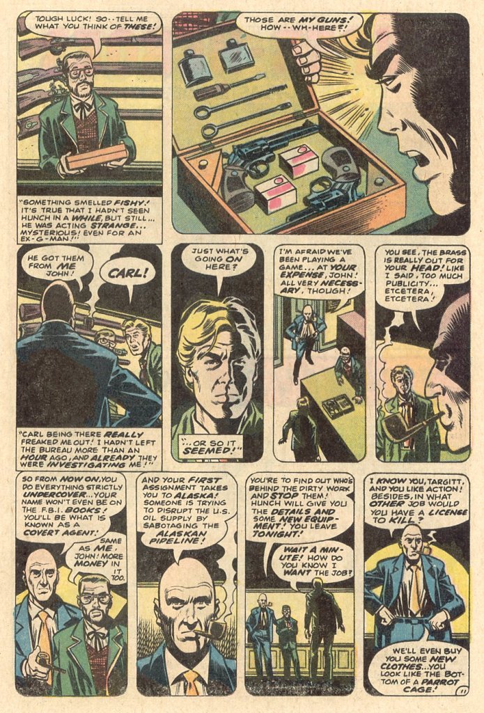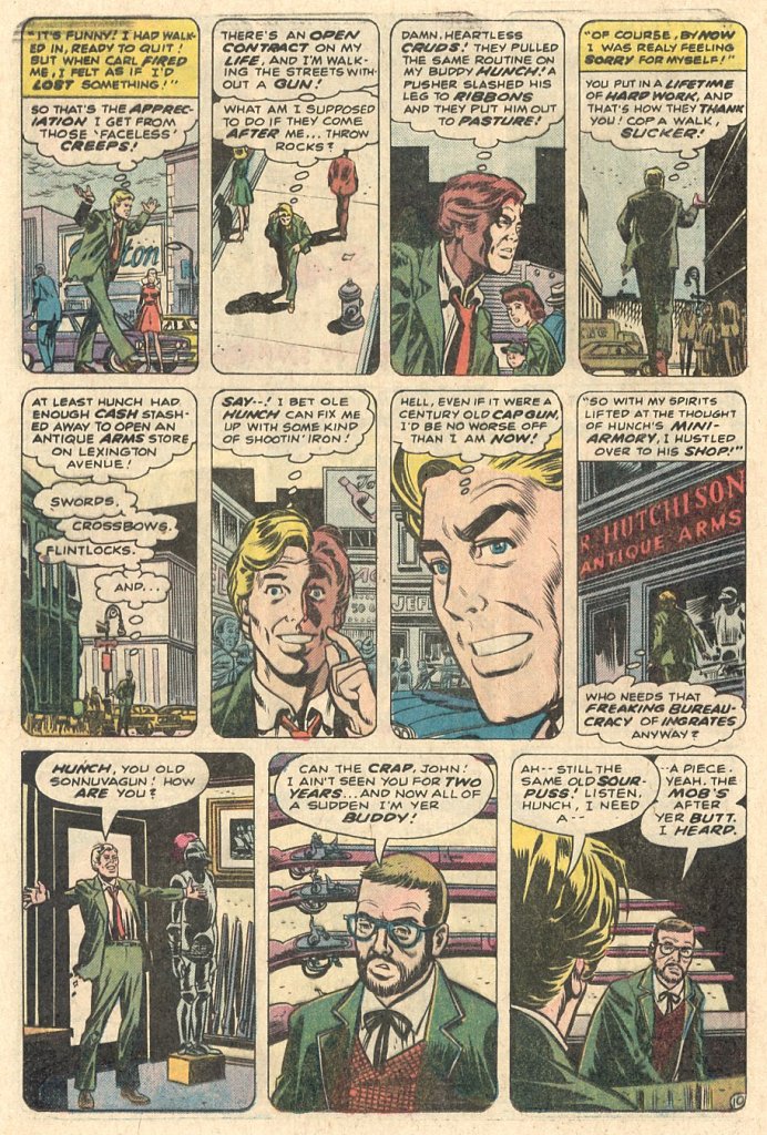 And here we go! On a dime, Targitt is suddenly wearing a super hero costume without a whit of genuine explanation. (He’s never referred to as Man-Stalker within the story either, only on the cover.) Looking over these pages, I actually wonder if most of teh images of the costume were after-the-fact redraws. That panel where it debuts above sure looks like an add-in, pasting over something else that had been there.