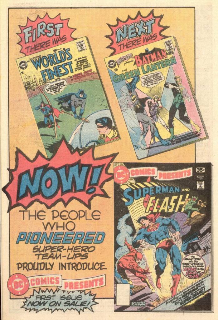I don’t recall offhand if I’ve written about this house ad before or not. But either way, it ran in this issue of FLASH as well. it was for the launch issue of DC COMICS PRESENTS, a new series that would feature Superman in team-up adventures with stars from throughout the DC line. First up was the Flash, which made it a comic of interest to me. But unfortunately, like most new DC books of this period, my local 7-11 didn’t carry DC COMICS PRESENTS, and I missed this issue. In fact, I wouldn’t see the book until #14, after I had started buying my new books at a newly-opened stationary store which carried a more complete selection. But I liked this glimpse of early issues of WORLD’S FINEST COMICS and BRAVE AND THE BOLD.