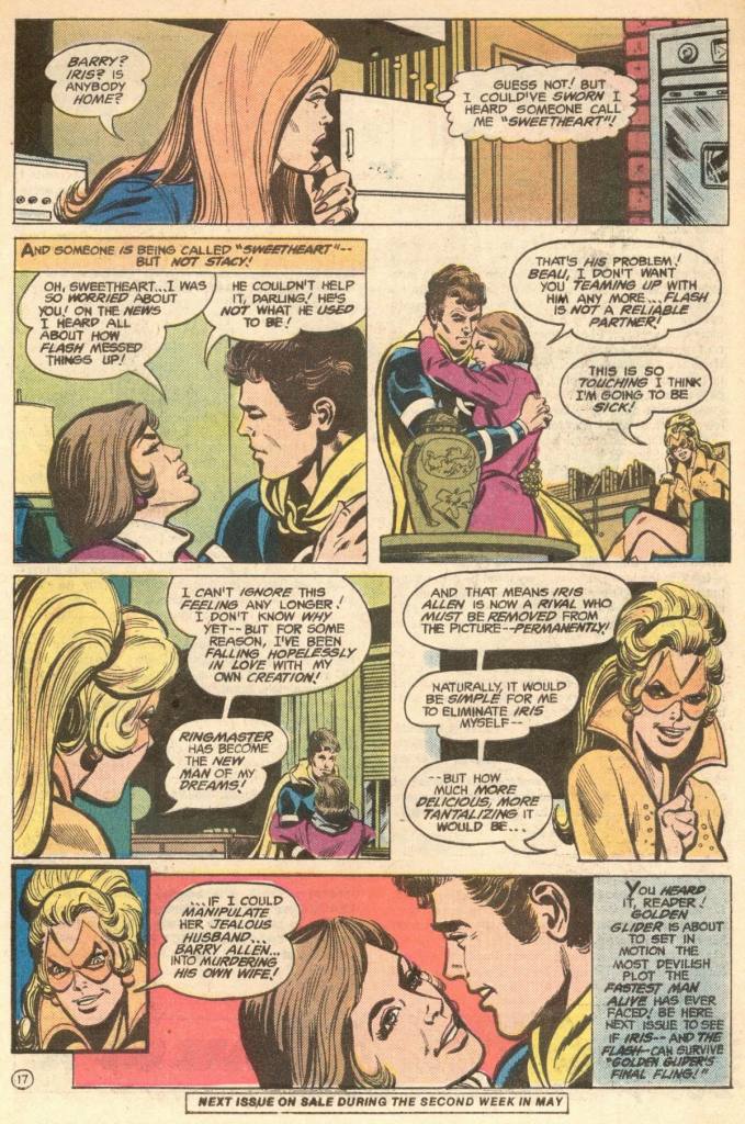 Elsewhere, in Beau Bael’s apartment, the Glider is once again observing invisibly as Iris tells her new man that the Flash isn’t a reliable partner, and that he shouldn’t continue to team up with him–a request that he readily agrees to. But there’s another complication brewing, and it’s this: after observing him up close and in battle, the lovelorn Golden Gilder has begun to fall for her own creation, the Ringmaster. And that means that Iris Allen has to go. But rather than simply bump Iris off herself and step into her shoes, the Gilder has a more delightful brainstorm: she’s going to manipulate the Flash into doing away with his own beloved wife! And on that somber note, the issue is To Be Continued.