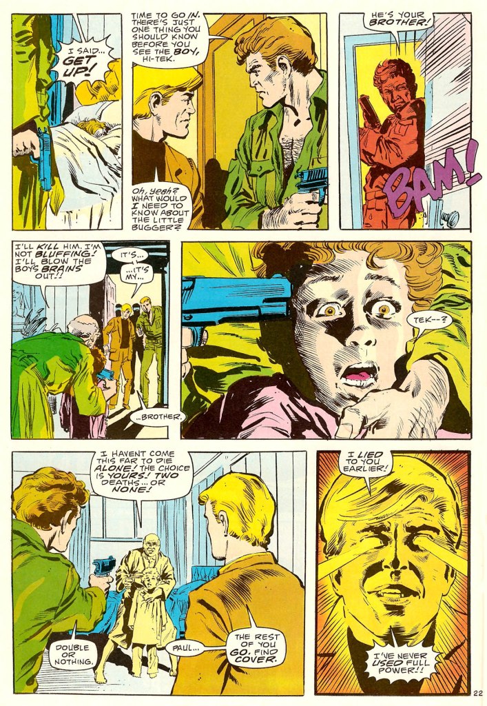 At some early point, though, Singer decided to switch gears. I get the sense that he not only never possessed the rights to publish Captain Action, but that he also had no intention of attempting to secure them. Like T.H.U.N.D.E.R. Agents, it seemed like he intended to see just what he could get away with–a course of action he may have re-thought once Carbonaro filed suit against him. So Codename: Action became Codename: Danger (there’s a tiny bit of the word ACTION that you can see in the logo, which has been covered over by the new box for DANGER) All of the more overt references to Captain Action were scrubbed from the first issue, but the IMF set-up was retained.