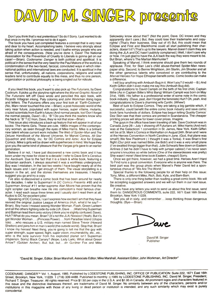 One of the ways in which David Singer got people talking was his editorial columns, in which he’d not only plug his own output but also sing the praises of titles from other companies that he was enjoying as a fan, including those from the Big Two. In fact, I believe this column was cited by DC’s legal department when they reached out to Marvel concerning the SQUADRON SUPREME series that Mark Gruenwald was then writing, as evidence that what was being done was too close to DC’s characters. Certain accommodations were made, and thereafter all was well.