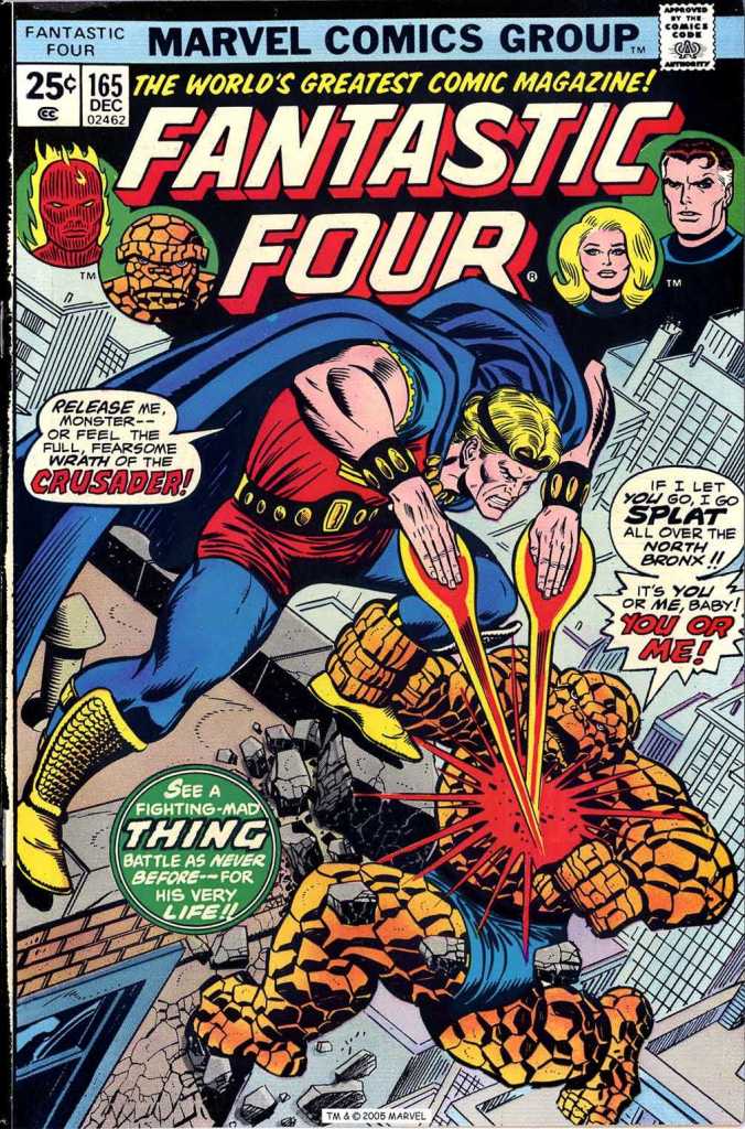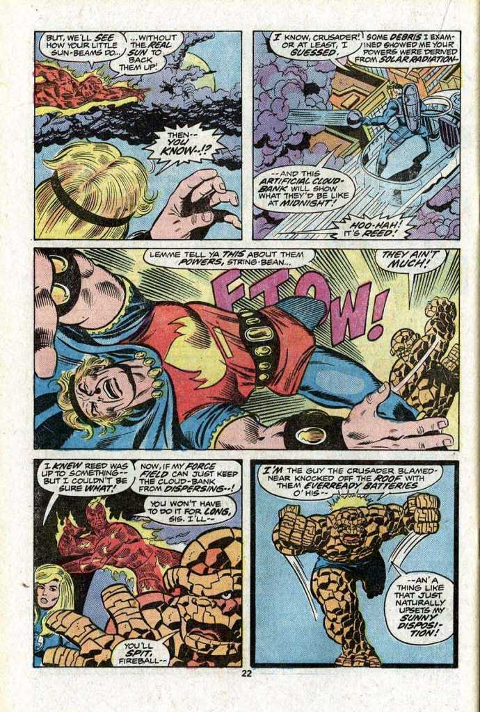 But enough talk. This is a 1970s Marvel comic, and that means it’s time for multiple pages of fighting! Reed has deduced that the Crusader is solar-powered, his wrist-bands storing up energy from the sun in order to empower him. So Reed creates an artificial cloud bank above the battlefield to cut the Crusader off from his source of energy. The angry former hero still has enough juice left to go toe-to-toe with the Thing for awhile, but his blows are rapidly losing their strength as he eats through his reserves of power. And meanwhile, we get to enjoy a Thing brawl, always an entertaining portion of a FANTASTIC FOUR issue.