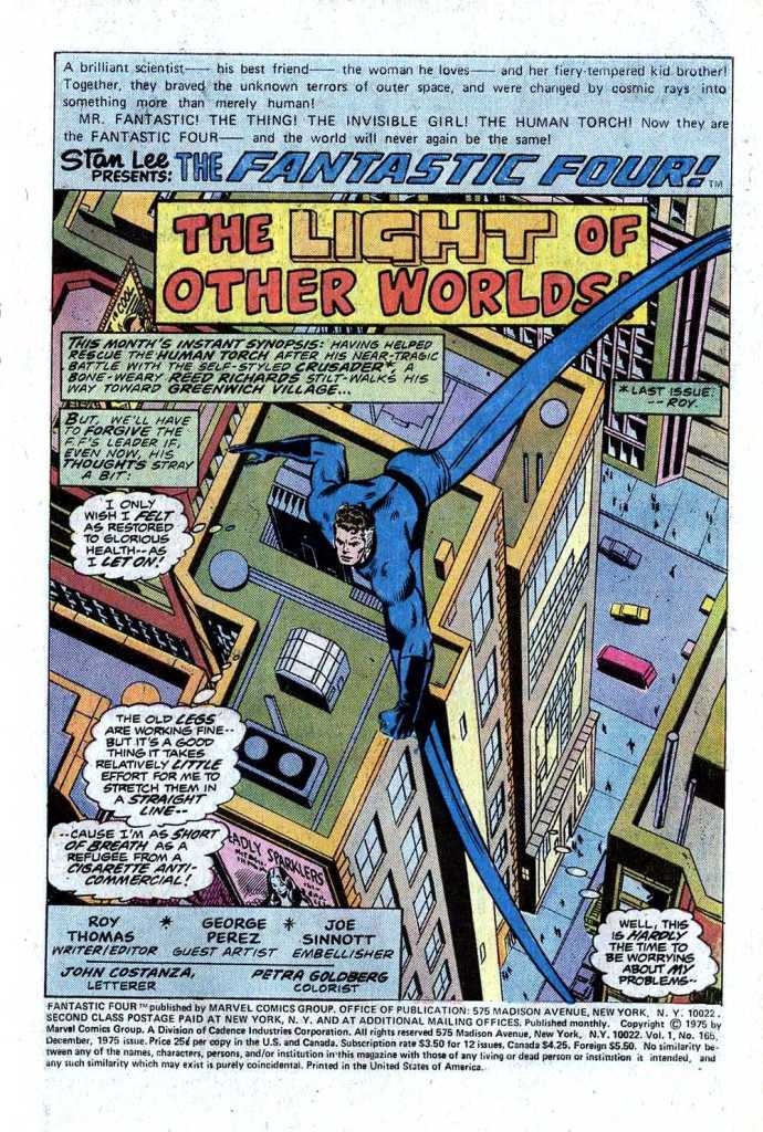 It’s worth taking a moment to spotlight the artwork in this issue, as it’s an early job from future superstar George Perez–his first time working on what was then considered the flagship series. George only got the job because this story hadn’t been intended for the main FF title at all, but rather the quarterly GIANT-SIZE FANTASTIC FOUR, which had suddenly gone to an all-reprint format, thus pushing the story into two issues of the main FANTASTIC FOUR title. George was inker here again by the great Joe Sinnott, and to hear him tell it, Sinnott really saved his bacon, making him look a lot better than he was at that moment. Still, the story goes that when the issues were published, Stan Lee made it a point to call George to his office in order to both meet and praise the young artist. He had made an impression. And he did the same for me–most of my earliest issues of FANTASTIC FOUR had been drawn by George, and his involvement is a big reason why I connected with the series so strongly.