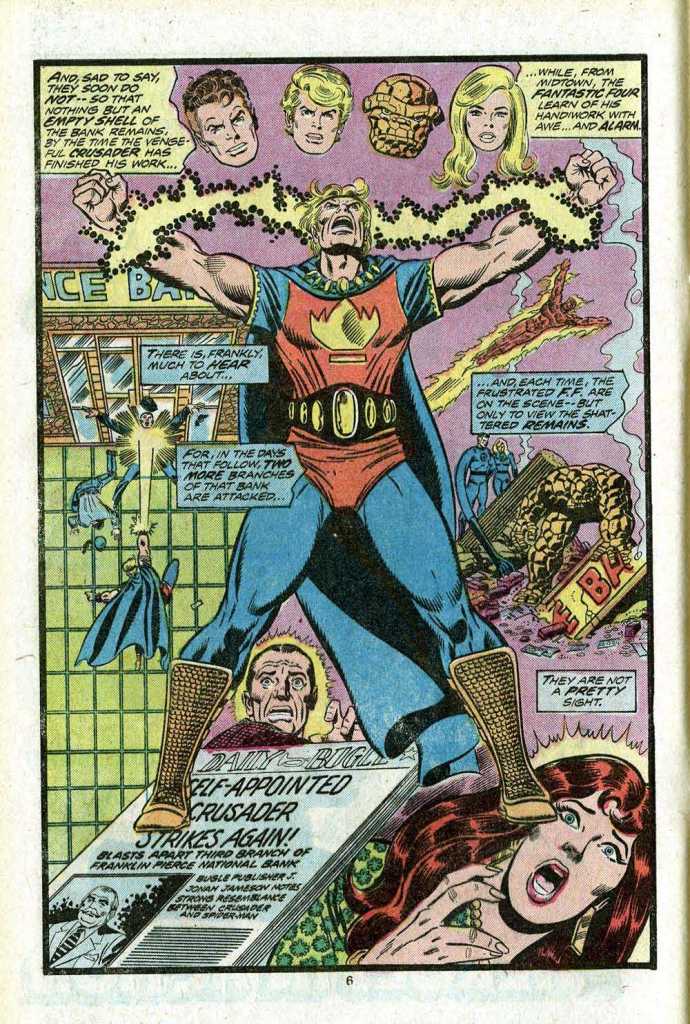 Anyway, having battled the Human Torch in the previous issue and soundly defeated him before making good his escape, the Crusader continues his war against the fat-cats whose greed causes them to step on others. In order to make him mor eof a match for the full Fantastic Four, Roy goosed up the Crusader’s powers from his Marvel Boy days, making his wrist-bands capable of doing a lot more than flashing light. In later years, Mark Gruenwald would reveal that they were actually the Quantum Bands, created by Eon to empower a Protector of the Universe, in that case Quasar. But that was still a ways away. (And, yes, Jeff Parker would eventually reveal in AGENTS OF ATLAS that this wasn’t the true Marvel Boy at all, but a demented clone. Having read these stories formatively, I choose to ignore that revelation, although your mileage may vary.)
