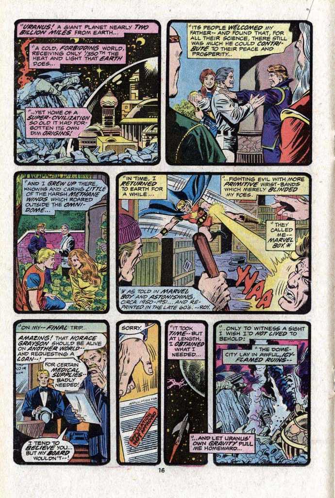 6. To bad Roy’s tunnel vision in telling HIS STORY here, didn’t let him see the REAL STORY of MARVEL BOY ( Bob Grayson ) [ Marvel Boy#1 ( December 1950 ) 1st story – page 5 panel 5 ( Professor Matthew Grayson – “I have enough uranium in this rocket ship to TAKE US TO THE MOON!” — ME, “I wonder what could be on the MOON that a Human could safely raise a child?” — BLUE AREA, anyone? ), panel 7 ( Professor Grayson – “Good heavens! The ship’s making a right-angle turn! We’re being DRAWN into another gravitational orbit by some Magnetic Force! We’re heading… good grief! For URANUS! — ME, “magnetic force” — a Tractor Beam”? )]. If Marvel Boy really need money he could have used his ship’s sensor’s to locate Gold or Silver on an island no one owns or sunken treasure or his telepathic ability to Robin Hood it from Mobsters who have plenty of money. Plus he could have gone for help from the Titanians or the Fish People in his first story. Lili ( a Uranian teen ) in Astonishing#5 ( August 1951 ) 5th story debunks that story told in the Agents of Atlas about how if Uranian Eternals tried to return to Earth they would be stopped by the native Uranians [ Agents of Atlas vol.1#3 ( Someone should make the native Uranians shape-changers so they can be those early 1960s shape-changing Uranians Marvel has like the Uboong in Strange Tales#100 ( September 1962 ) 3rd story –“Beware The Uboong!!” ) ] — she wasn’t invited to Earth ( or those 2 Non-Marvel Boy Atlas Age Human Uranian stories I found ).