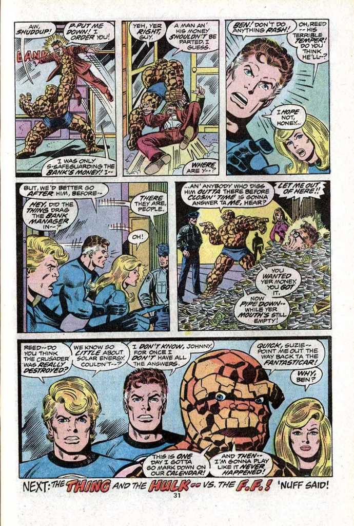 Eventually, though, the Crusader is confronted by the entire Fantastic Four all at once–and in order to face their combined power, he sets his wrist-bands past their safety limits to gain maximum absorption of the sun’s rays. Unfortunately, the cloudbank that Reed had set up is drifting away by this point, and so the Crusader absorbs more solar energy than the bands can process. he promptly blows up, ending his rampage for good (while keeping the FF’s hands clean in his demise.) And the issue ends with the sort of cute bit that used to be common in the Marvel books, where the irate Thing, having been hassled by the owner of the bank for all the damage the fight had been causing throughout the issue, buries the man under the contents of his own vault, and tells the bank employees that nobody had better dig him back out until closing time.