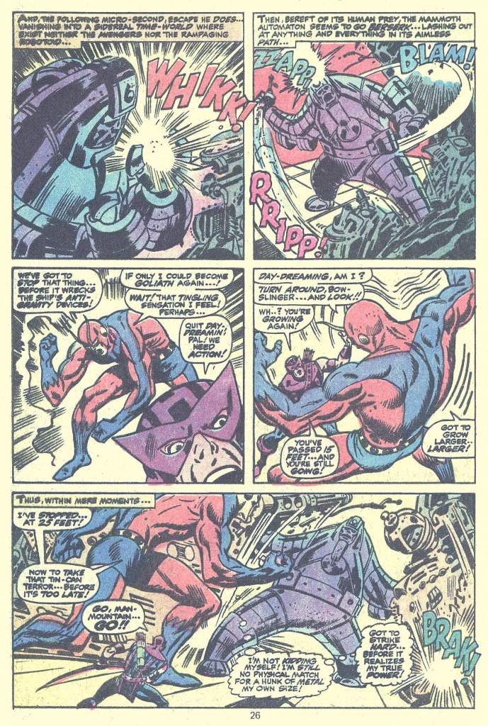 Fortunately for the Avengers, the tide is about to turn. The Wasp is able to escape her cell with the aid of one of the Collector’s other specimens, which is close enough to an ant for her to communicate with and command. She swiftly liberates Hawkeye and Goliath, and the three hurl themselves at their abductor. But it’s still a pretty one-sided fight since they’re trapped aboard the Collector’s ship and forced to combat all of his defensive technology. But it turns out that the Collector didn’t’ want a damaged Goliath as a part of his collection, and so he took the liberty of restoring Hank’s size-changing powers–which is good news as the Avengers are assaulted by a 25 foot robotoid. Showing off his restored abilities, Goliath makes fast work of the robot, ripping the thing apart. The Collector’s ship is rocked by a series of explosions from the damage done to its inner workings, so the Avengers need an escape route. But elsewhere, having overcome Iron Man, Thor rousts from his trance.