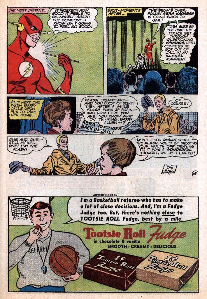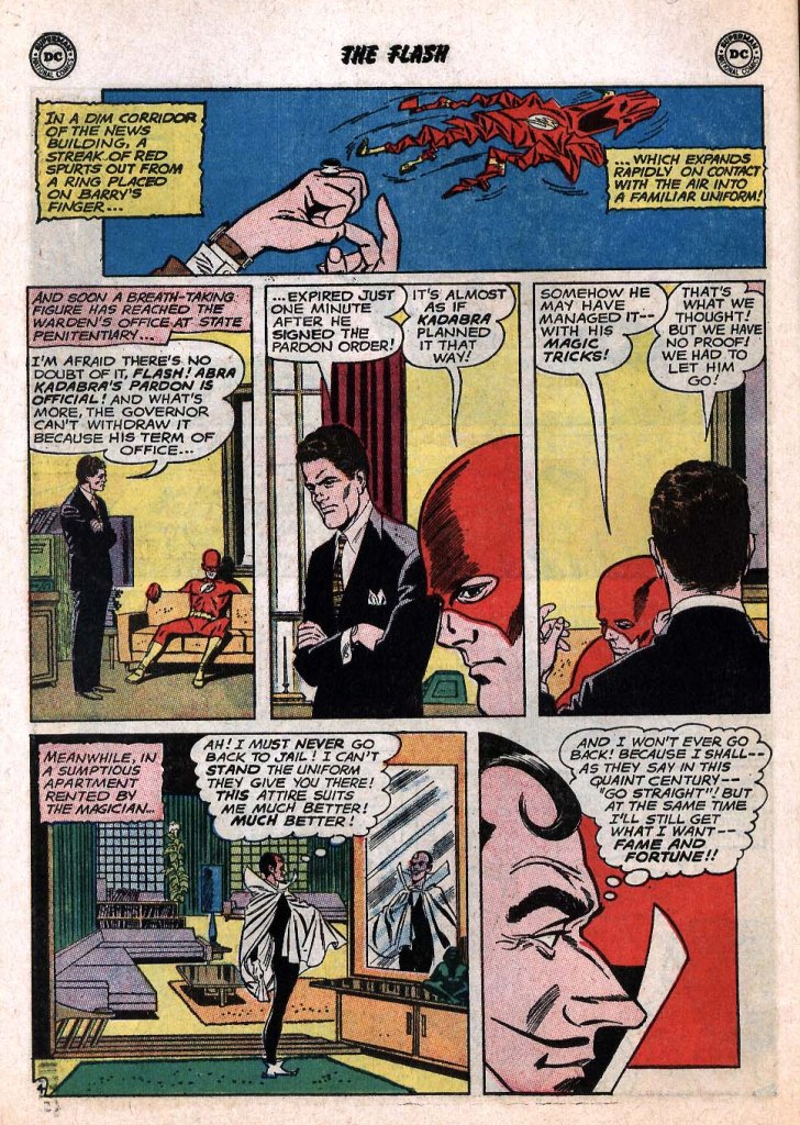 Well, not quite nothing, as it turns ut. The Flash still retains his perfect control of all of his body’s molecules, a side effect of his powers (and one might argue, his real power all along, his speed being a byproduct of this control.) Using this ability, he’s able to inflate his wooden body like a balloon using “spare molecules”–how that quite works, I’ve no idea. This gives him enough control over his movements to first flatten the Captain Creampuff puppet and then the stunned Abra himself. He’s then able to use Abra’s wand to restore himself to normal–and lets the crowd know that he’s taking Abra back to prison, banking that the magician will confess how he coerced the governor into releasing him prematurely. I don’t know that this would hold up, but in a Comics Code-driven world, it does, and Abra’s return to jail is headline news the next day. Barry is even able to allay any suspicions that Iris may have about him being the Flash by confessing that he is in order to double think things. One wishes he could have been similarly forthcoming after he and Iris were wed a few years down the line–but that’s a story for another time.