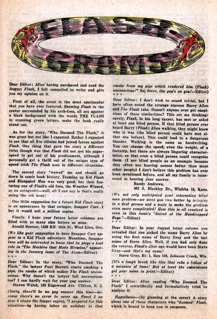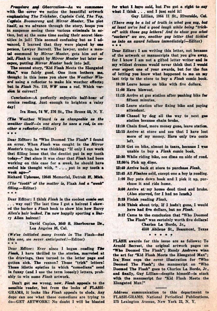 Next up came this issue’s two-page letters page, Flash-Grams. The big attraction here, as indicated earlier, is that editor Julie Schwartz had begun awarding published letter writers the original artwork and original scripts for the issues they reviewed. This practice didn’t last all that long–I’m not certain why it stopped, though it seems obvious that somebody somewhere had an objection to it–but this practice did ensure that a bunch of this original artwork survived until the present day. These awards are even questioned by regular correspondent Guy Lillian in this very column, who felt that the prospect of earning original art was leading to readers writing what he termed gag or gimmick letters in the hopes of winning the prize, thus downgrading the value of the page itself.