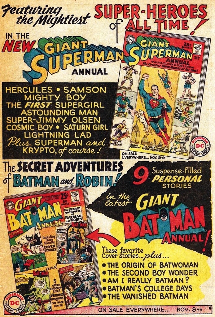 And the issue closes with another Ira Schnapp ad, this one for two of DC’s 25 cent Annuals featuring in this instance Superman and Batman. I’m pretty sure we’ve shown this particular ad before, but once again, it’s too wonderful not to share one more time. Who could resist those covers and titles?