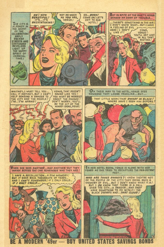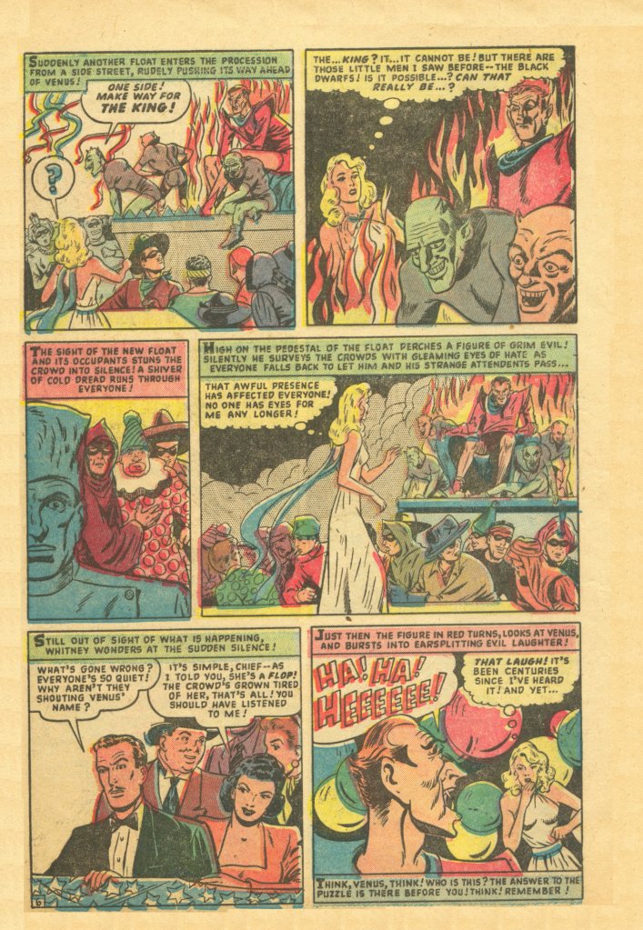 VENUS was a weird comic book, one that went through a myriad of tone and genre changes across its 19 issue lifespan. It was first launched in 1948 during a time when Marvel (then Timely) was attempting to establish a beachhead of female-led super hero titles. So along with VENUS, also launched at that point were SUN GIRL (who was also featured with the Human Torch in MARVEL MYSTERY COMICS and his own magazine), NAMORA (same thing, except with the Sub-Mariner) and BLONDE PHANTOM (who took over ALL SELECT COMICS, where she’d debuted). VENUS was the only one with any staying power, and that was largely due to the flexibility of the concept: it was about the actual Roman goddess who came to Earth again after several centuries and fell in love with a magazine publisher, signing on board as the editor of Beauty magazine as a result. Venus wasn’t really a super hero, although she did possess a series of godly powers and got into adventure situations quite regularly. The stories skewed all over the place–some were adventure yarns with a mythological bent, some were straight-up romance stories, some were humor strips, and eventually (once Bill Everett, the Sub-Mariner’s creator) had come aboard to take over the strip, supernatural horror and science fiction. Really, this title did everything.