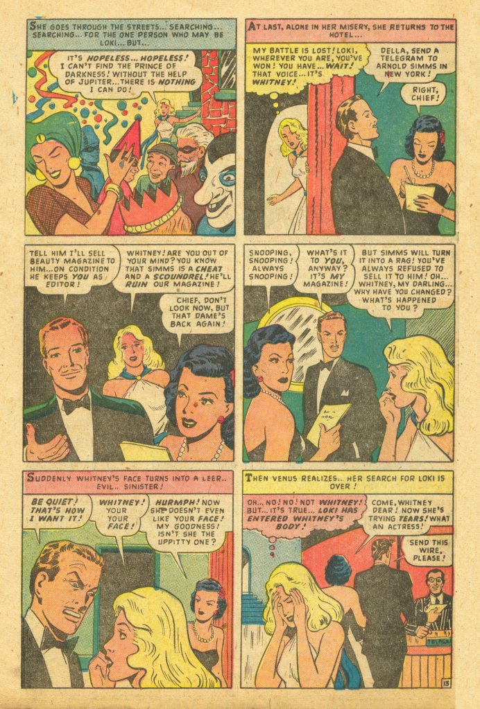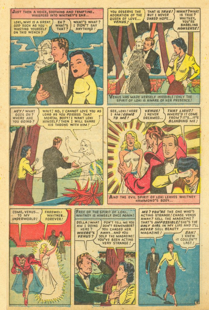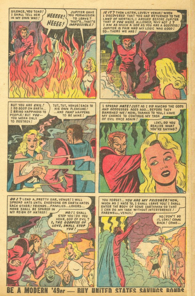 But what we’re interested here is the sixth issue of the series, published in May of 1949, most of which was taken up with a long three-part story in which the title character was forced to contend with the evil ambitions of Loki–despite the fact that the God of Mischief came from an entirely different pantheon of mythological gods. The creators on VENUS didn’t seem to care very much about historical accuracy, and so they mixed and matched their godly and mythological figures from across everything.