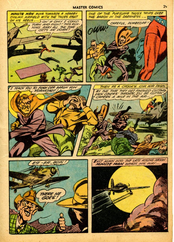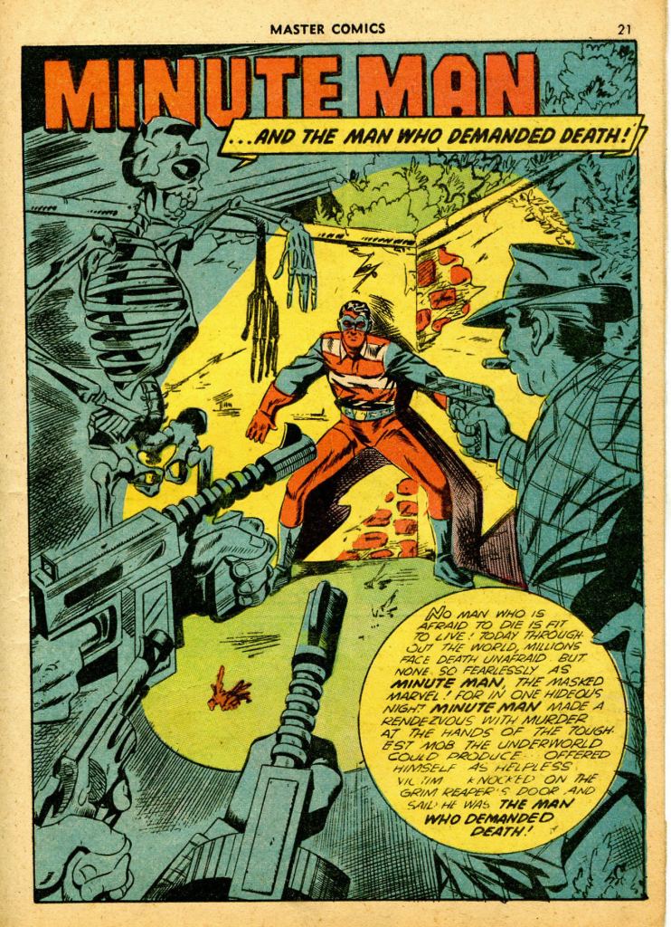 The Crime Crusaders Club made its only appearance in the Minute Man strip. The author’s name lost to history, but the artwork appears to have been contributed by Phil Bard. The Club was comprised of all of the costumed heroes whose adventures filled the pages of MASTER COMICS; Minute Man himself, of course, captain Marvel Jr. and Bulletman and Bulletgirl. (Hopalong Cassidy and Balbo the Boy Magician apparently didn’t have the goods to make the cut.) Minute Man was one of Fawcett’s attempts to ride the patriotic super hero bandwagon that had been heated up by the first appearance of Captain America. There’s not really anything much to distinguish him for the dozens of other star-spangled super heroes who gave the Axis fits during the war years.
