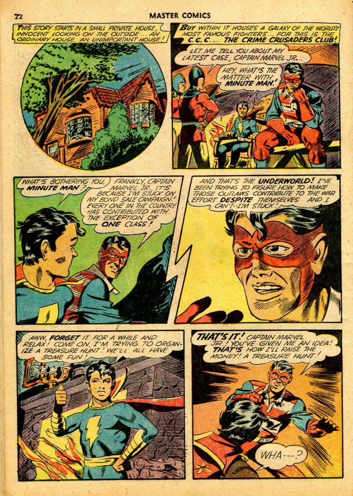Still, there were a couple of times that a publisher put out a story in which a bunch of its costumed champions united in common cause, but those stories all wound up being one-offs. One of those appeared in this 1943 issue of MASTER COMICS from Fawcett Publications, and which we’ll look at a bit more closely. This story was considered so not noteworthy that it was buried in the middle of the book and there wasn’t any kind of call-out about it, even on tis contents page. If not for Roy Thomas writing about it in the All In Color For A Dime feature serialized in the fanzine XERO in the early 1960s (and eventually collected into book form in 1970) I wouldn’t even be aware of it. So come, let us check in on the first and only meeting of the Crime Crusaders Club.