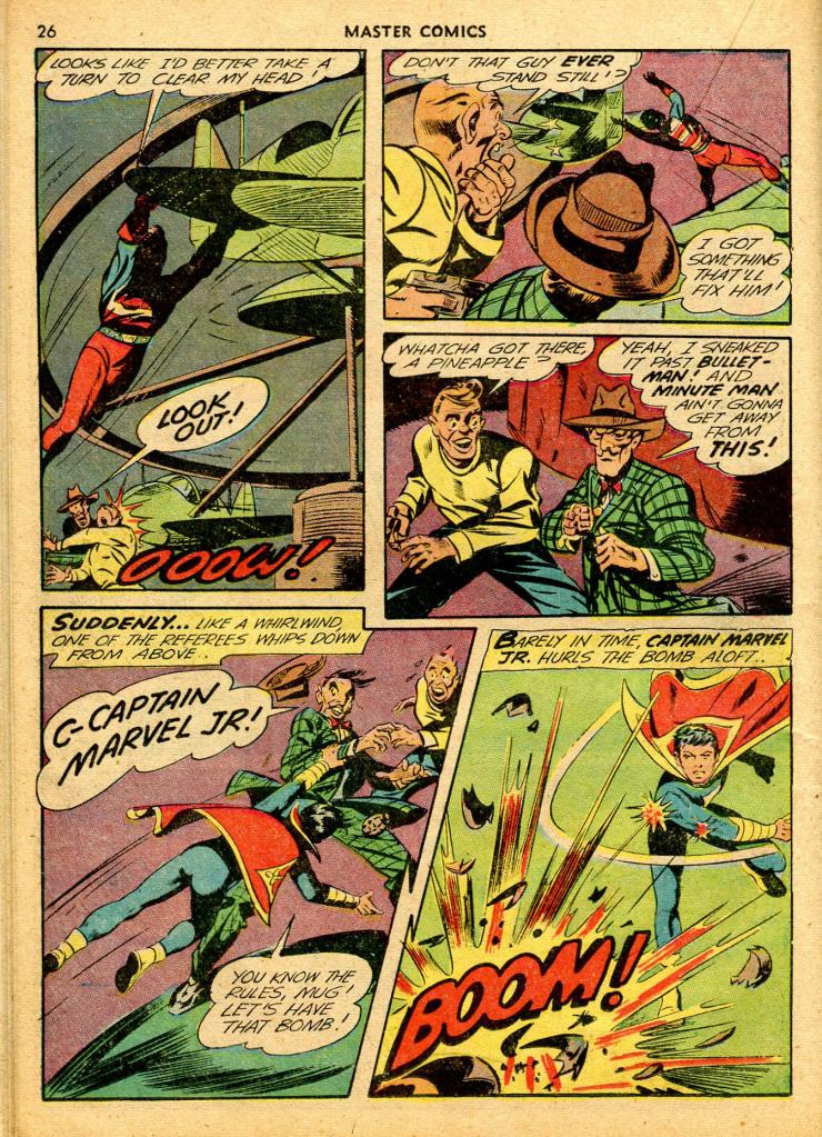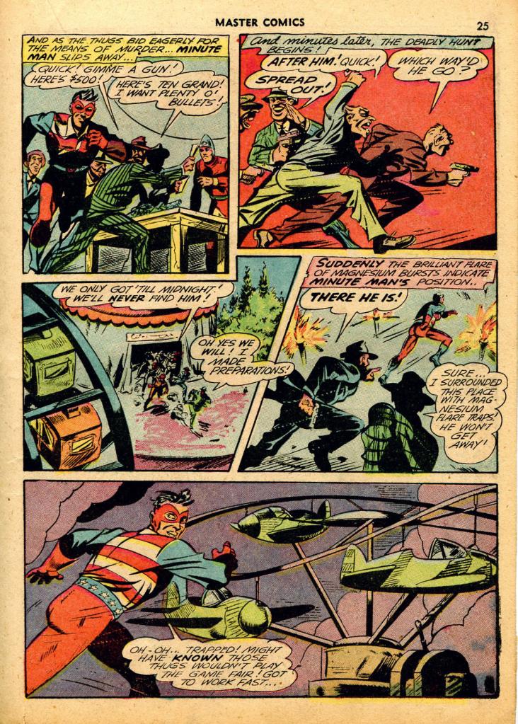 The story is a naked shill for the purchase of war bonds, but it’s wrapped in a fun adventure. As we open, Minute Man is concerned because there’s one segment of the American population that hasn’t been doing their part to contribute to the war effort–and that’s criminals! He hits on the frankly insane idea to stage a bond drive where he’ll give criminals a free chance to kill him in exchange for them buying war bonds. Hey, this wasn’t any more dangerous an idea than fighting in that conflict, so it does kind of make sense. That’s a paste-up of a Mac Raboy Captain Marvel Jr. figure in the fifth panel above, I believe–Raboy kept stat sheets of key poses to use again and again in the strip, and here Bard (or editor Rod Reed) must have borrowed one to keep Junior looking on model.